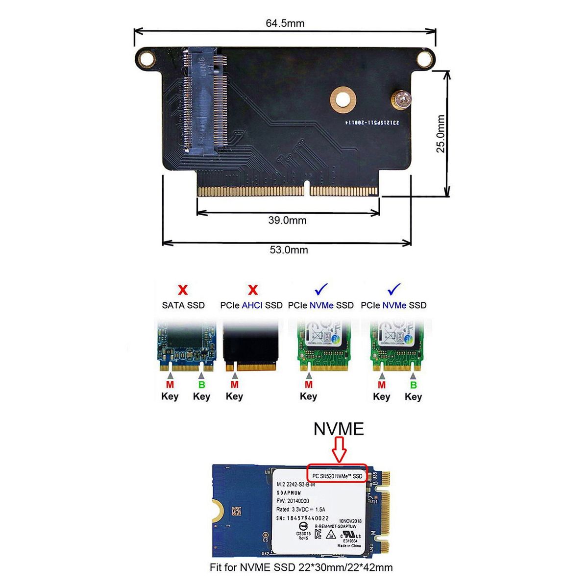 1. The adapter card only supports NVMe M.2 NGFF SSD hard disks with specifications of 2230 2242.