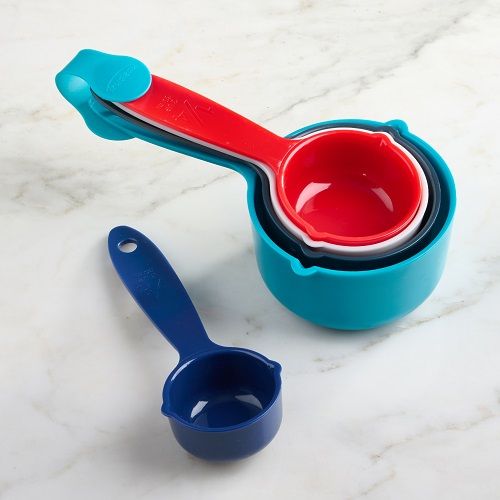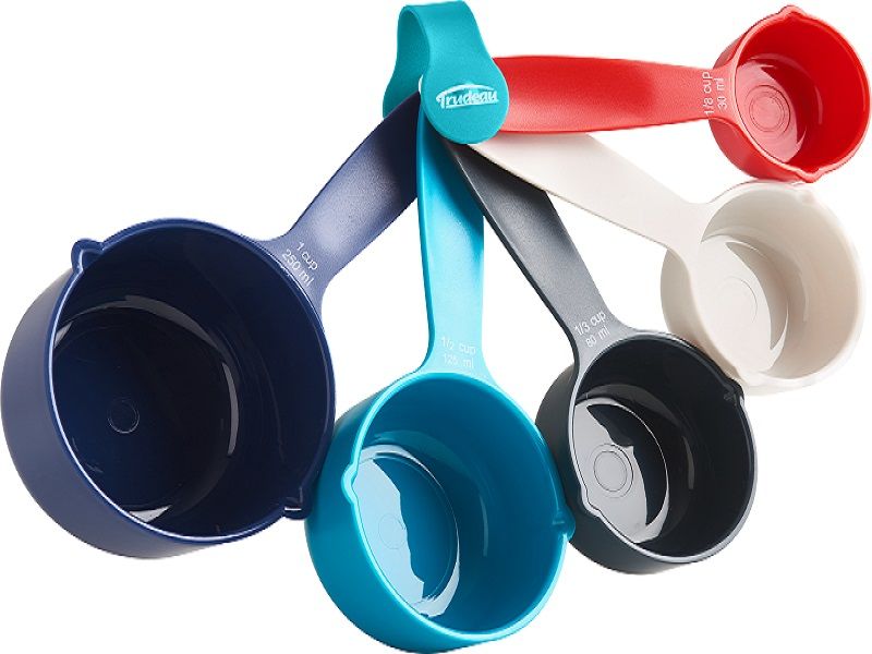 The Measuring Cup Set by Trudeau is a 5-piece set that includes 1/8 1/4 1/3 1/2 and one cup sizes. Cups are made of strong corrosion resistant plastic and include imperial and metric measurements. This colorful set includes a red yellow orange green and blue cup. Neat compact design. Dishwasher safe.