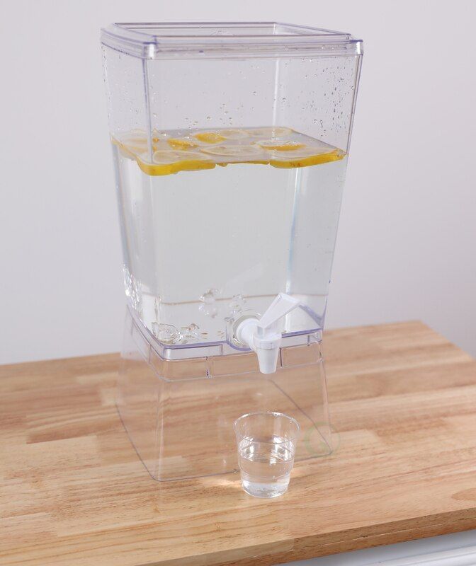 HEALTHY WATER & JUICE DISPENSER (Infusion Water) containers of drinking water are made of plastic fiber / Mika BPA Free safe for consumption . Capacity of each container: 6.5 litres. Equipped with a tube filter to place ice cubes or fruits of your favorite functions as a drip water.