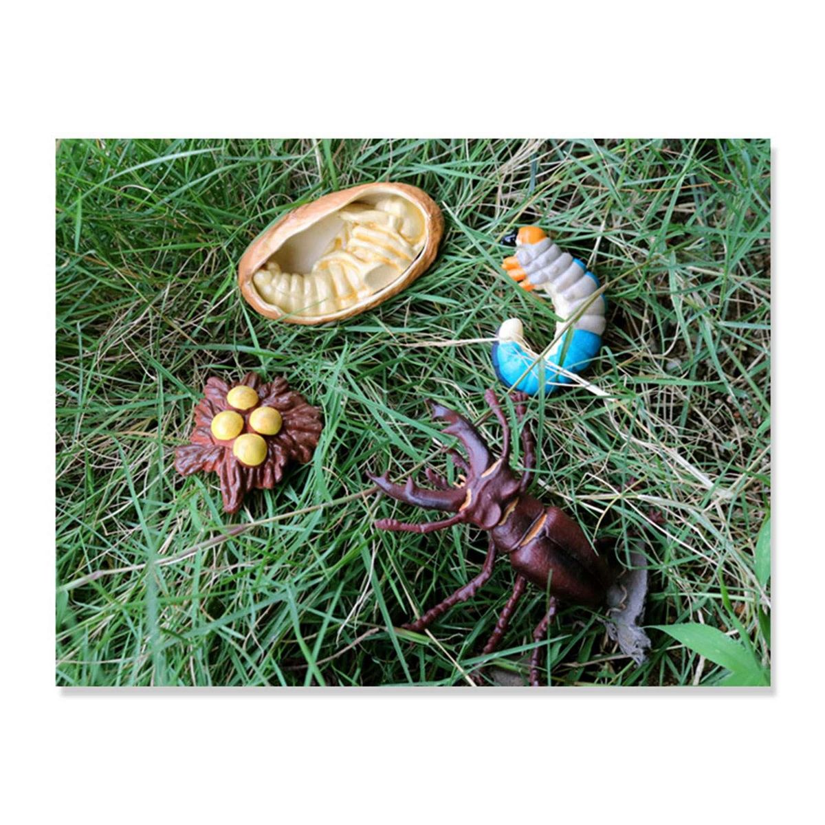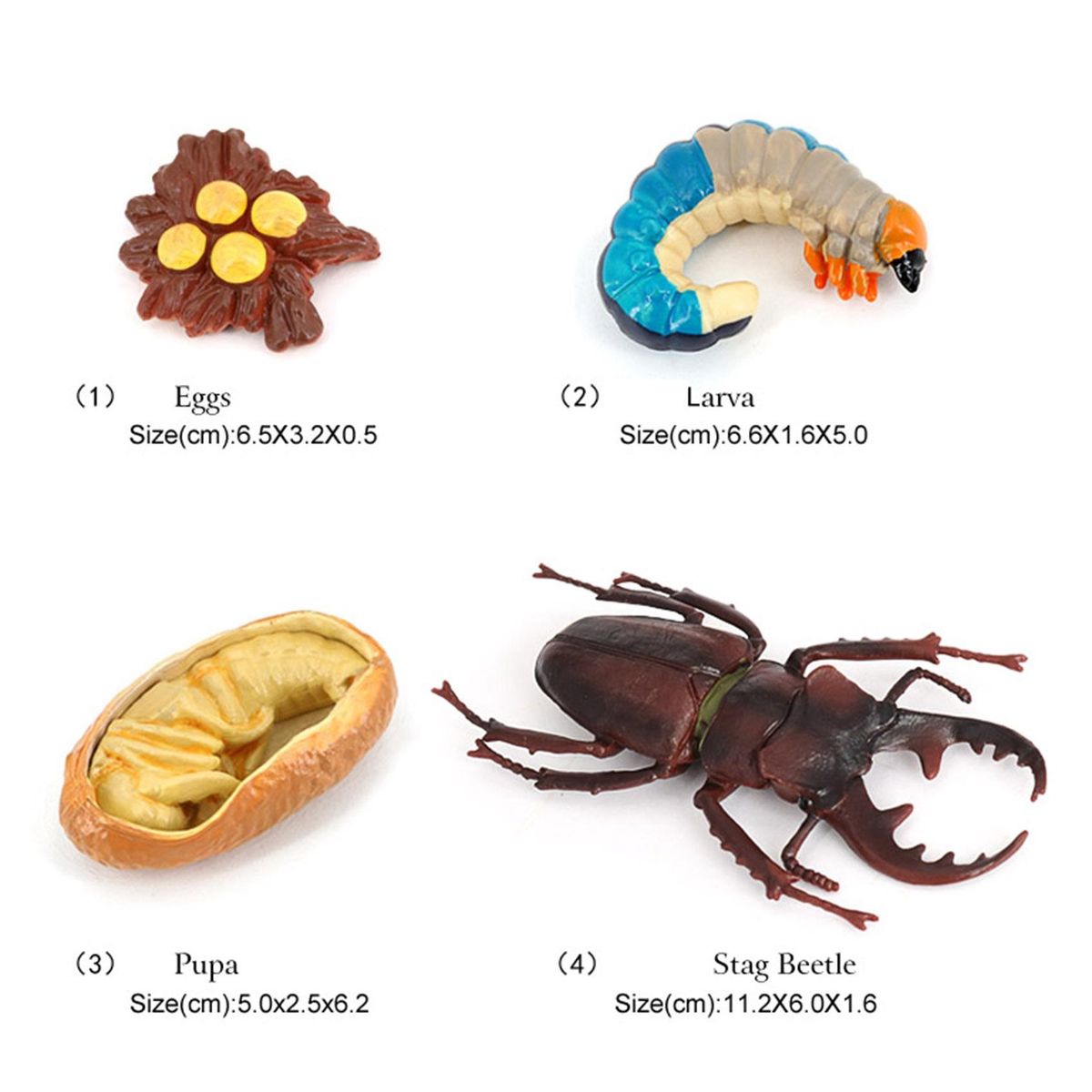 Size: 2408: Stag beetle growth cycle, egg: 6.5x3.2x0.5cm, larva: 6.6x1.6x5cm, pupa: 5x2.5x6.2cm, stag beetle: 11.2x6x1.6cm