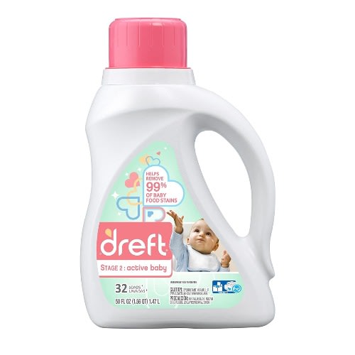 When baby starts to eat and explore the world, things can get messy! Dreft Stage 2: Active Baby HE Liquid Laundry Detergent gets out 99% of food and crawling stains from baby clothing, including pajamas, dresses, sweaters, shirts, coats, hats, baby socks, baby shoes, and bibs. Also perfect for cleaning bedding and other baby fabrics, including sheets, blankets, towels and cloth toys. Dreft Stage 2: Active Baby Liquid Detergent is specially designed with your developing baby in mind. That & rsquo;s why it helps remove 99% of baby food stains and all the messes baby finds while crawling in grass and dirt. Let Dreft Active Baby care for the messes, so you can spend more time enjoying the precious moments of babyhood. The standard size 100 oz. container will keep you covered for 64 full loads. What's more, it's designed to work in both standard and high efficiency (HE) washing machines, so you can use Dreft products no matter what kind of washing machine you have. When baby starts to eat and explore the world, things can get messy! DStage 2: Active Baby HE Liquid Laundry Detergent gets out 99% of food and crawling stains from baby clothing, including pajamas, dresses, sweaters, shirts, coats, hats, baby socks, baby shoes, and bibs. Also perfect for cleaning bedding and other baby fabrics, including sheets, blankets, towels and cloth toys.DreftBrand
