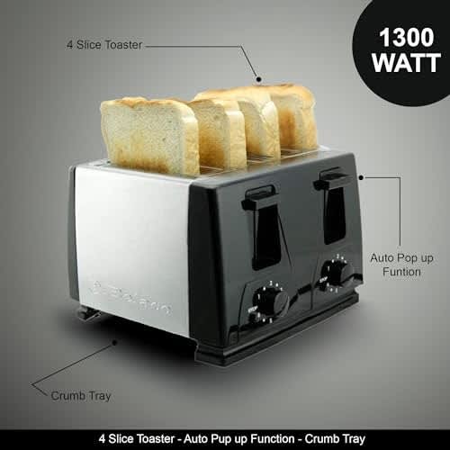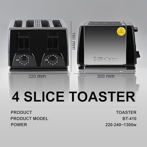 ADJUSTABLE: The Belaco 4-slice toaster is immensely powerful at 1300W and comes equipped with two switch knobs so you can turn these to have your toast more toasted or less. This makes it easy as you do not have to keep using the pop-up mechanism. Simply find the setting you like, and you will be set.