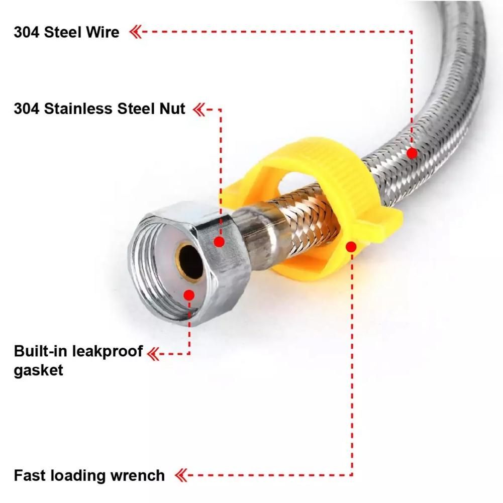 Loose nut female ends with washers on either ends connect to standard kitchen and basin pipework.