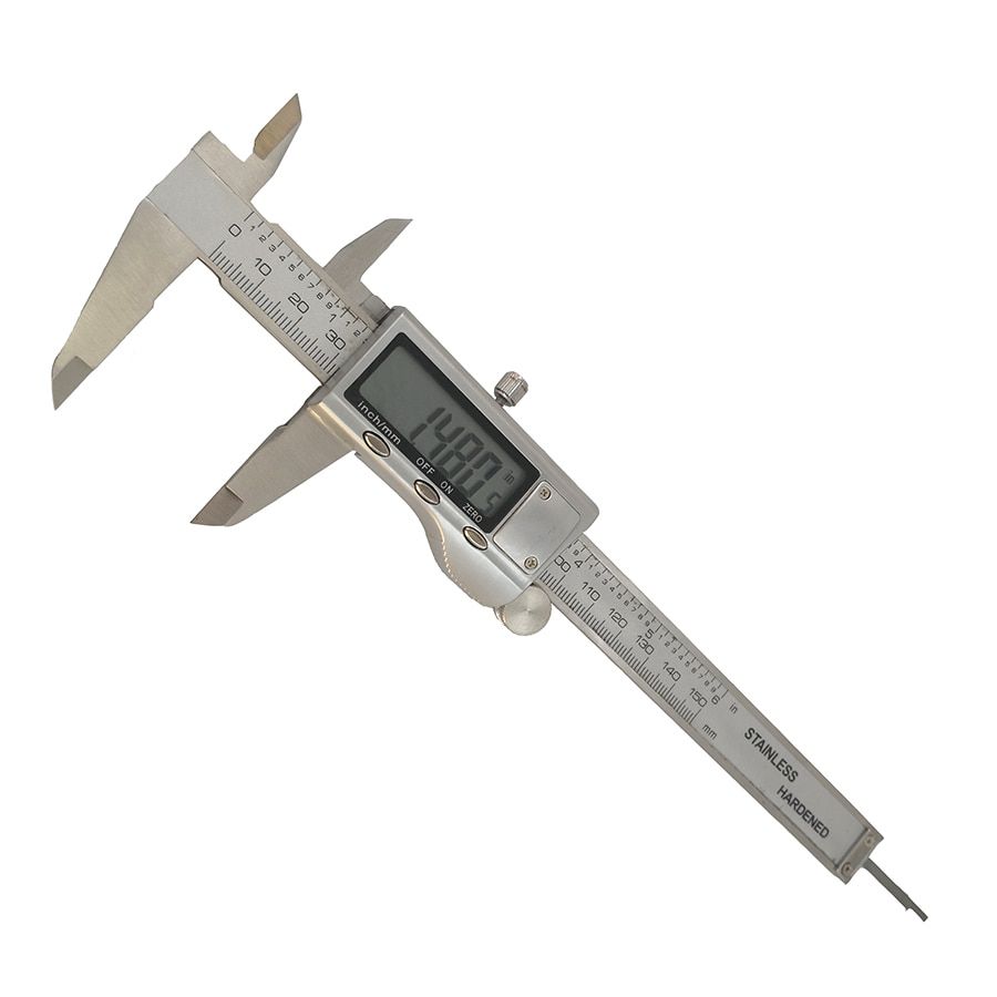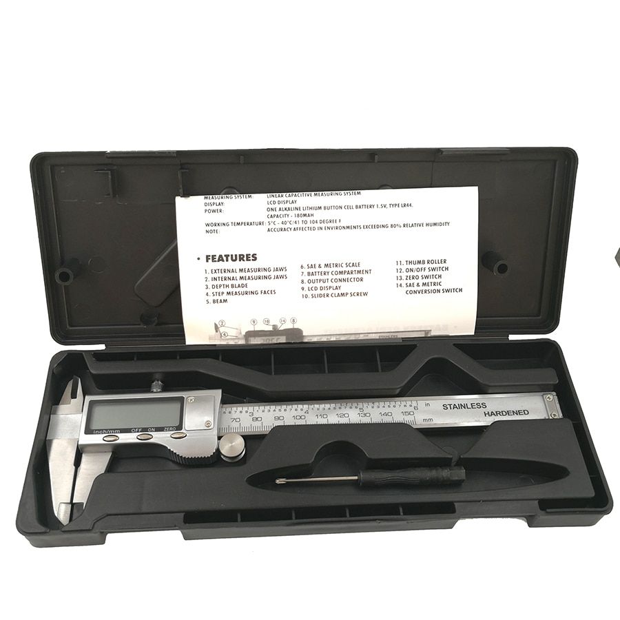 Material: All metal stainle steel Range: 0-150MM 6inch Accuracy: 0.01 mm / 0.0005 in Measurement unit: mm/ inches. Resolution: 0.01mm/0.005in Accuracy: + / - 0.02 mm / + / - 0.001 inch Zero calibration switch Automatic On / Off