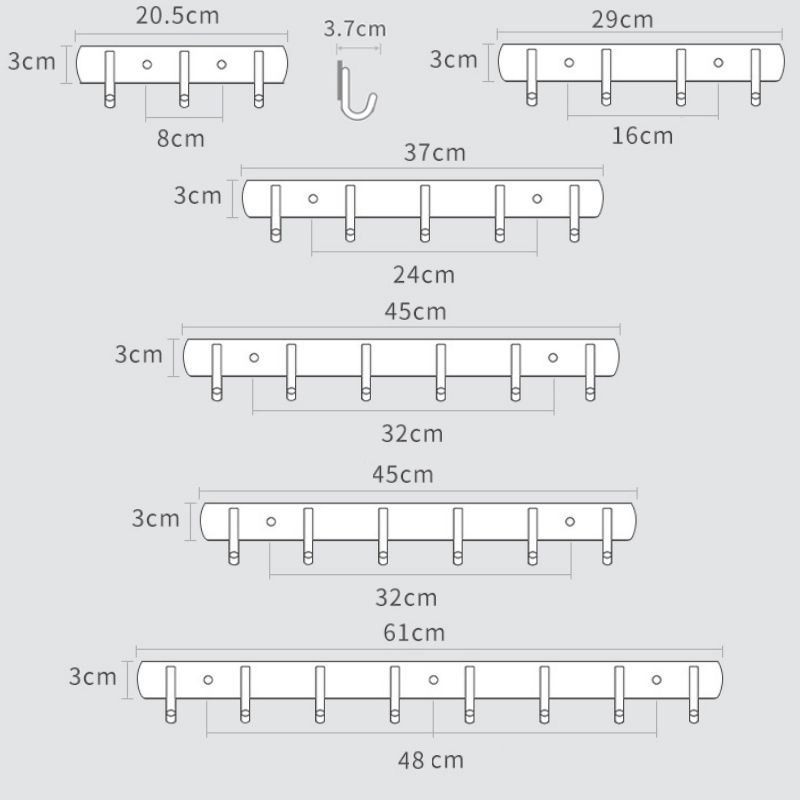 7. Size: 3 hooks 20.5x3 cm, hole spacing 8 cm; 4 hooks 29x3 cm, hole spacing 16 cm; 5 hooks 37x3 cm, hole spacing 24 cm; 6 hooks 45x3 cm, hole spacing 32 cm; 7 hooks 53.5x3 cm , the hole spacing is 40 cm; the 8 hooks are 61x3 cm, the hole spacing is 48 cm; the 201 erfly hook is 6 cm long and the hole spacing is 3.5 cm