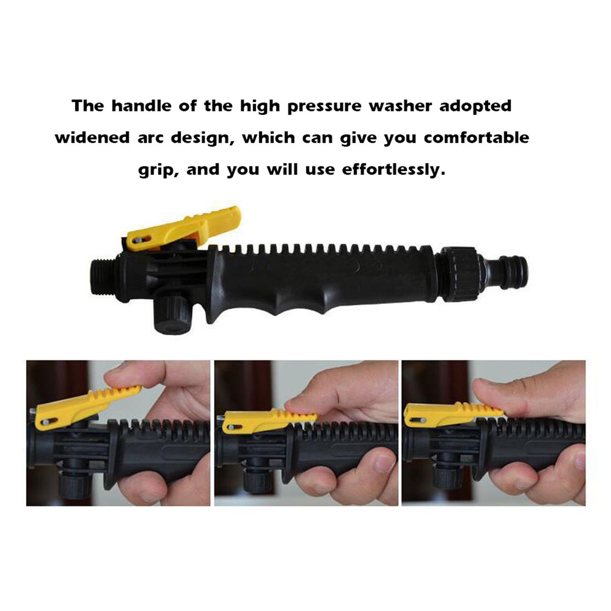The handle of the high pressure washer adopted widened arc design, which can give you comfortable grip, and you will use effortlessly.