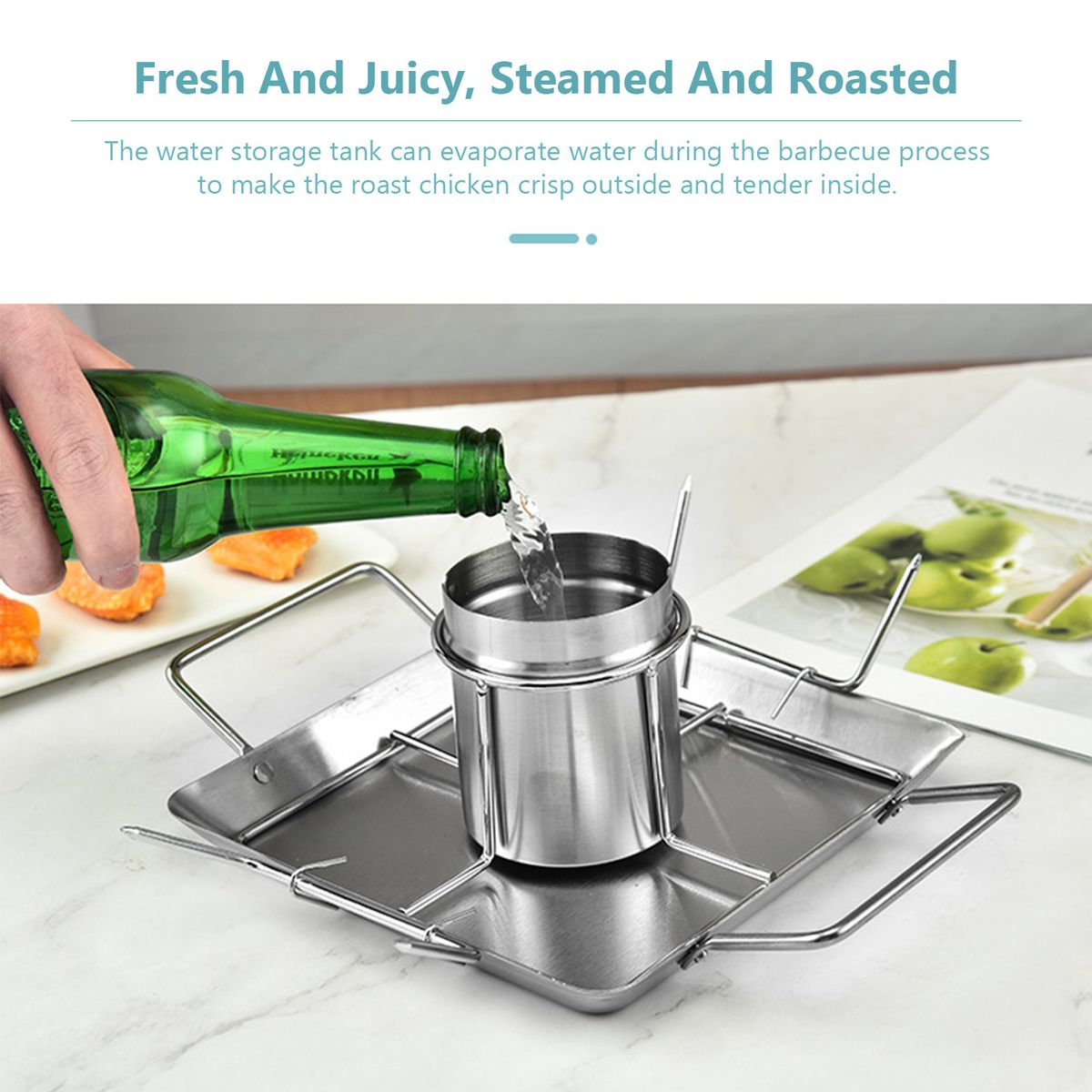 [Secret Of Making Roast Chicken Fresh And Juicy] the water storage tank in the center of the baking plate can evaporate water vapor during the barbecue process to achieve the function of steaming and roasting, making the roast chicken crisp outside and tender inside.