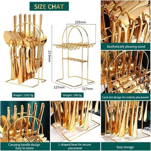 24 piece gold silverware set: Includes 6 each dinner spoon, dinner fork, dinner knife, teaspoon,