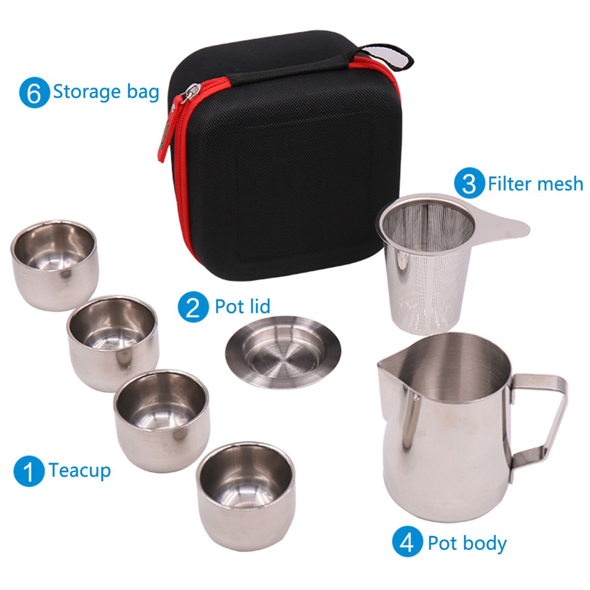 The tea set includes teapot and teacups, food-grade stainless steel material, anti-hot use, not spilling water. It is portable for outdoor picnic, universal for all stoves.