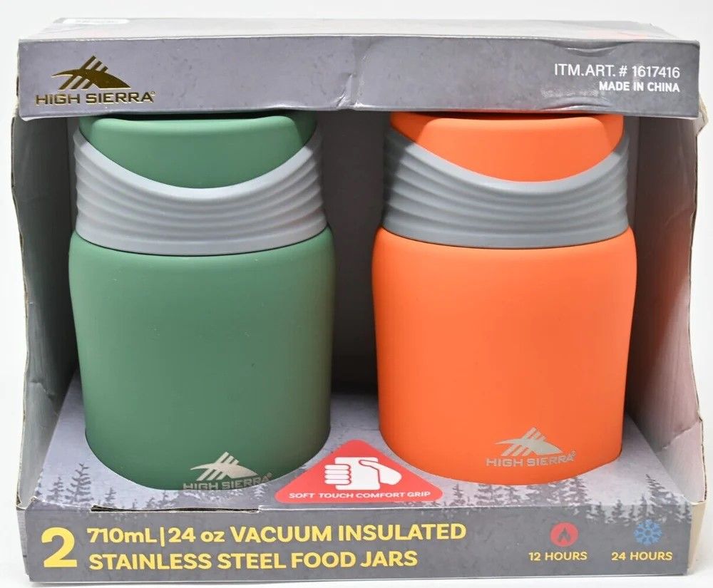 High Sierra. Constructed of double walled stainless steel with vacuum insulation, these foods jars will deliver high performance temperature retention, hot or cold. The jar has an integrated folding stainless-steel spork and an easy twist off lid. It holds 709 ml (24 oz) of food and seals tight to prevent leaks and spills.Money saving alternative for lunches on the go:Are you looking to save money on buying lunches out during the work or school day? This insulated food jar is the perfect option to cut costs and also reduces waste. The food jar is fully reusable and gives you the option of packing up leftovers for lunch the next day or keeping fresh soups and casseroles in it to enjoy when you're away from home.