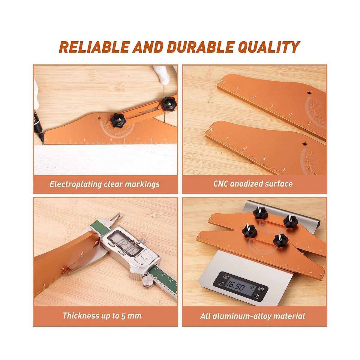 RELIABLE AND DURABLE: The stair gauge is made of aluminum-alloy material, making it resistant to damage and bends. The CNC anodized surface is wear-resistant and rust-proof, and the electroplating markings are more precise and clearer. With superior quality, reliability and durability, this stair measuring tool will help you lay out stair treads, risers and shelves. adjust the angle and length to meet any work requirements.
