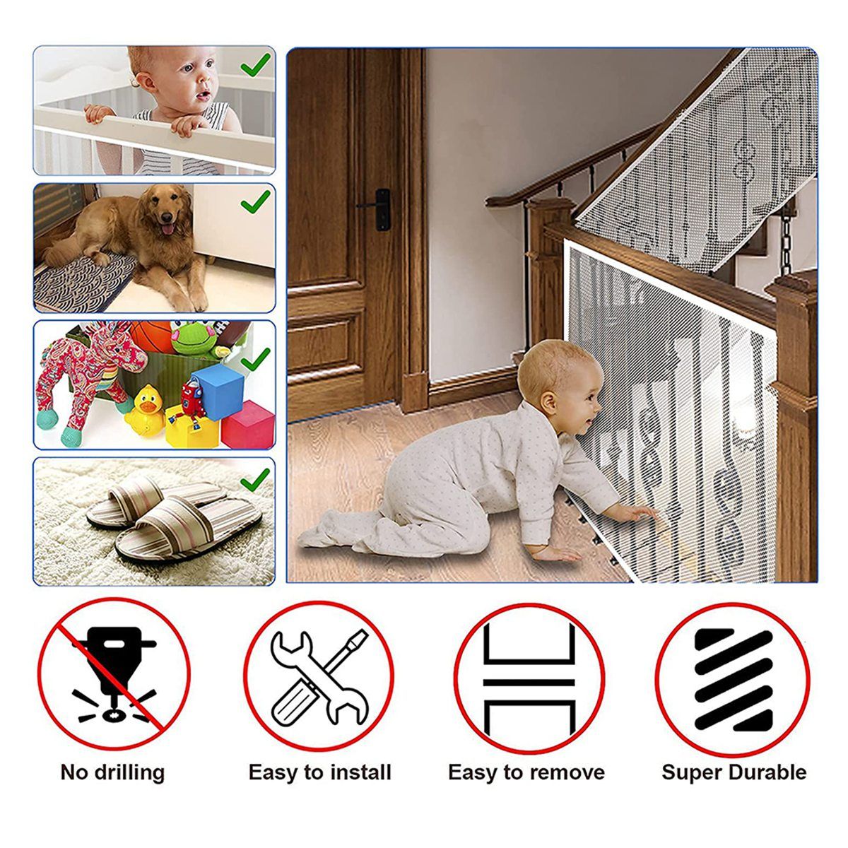 Name:Stairway Net - Baby Safety Rail - Balcony Railing Guard for[High-Grade Durable Material] The stairway net is well made of thick hard mesh. Compared to other nets, which are made of flimsy material, our rail net is made of premium fabric that is resistant to tear. The net is also weatherproof and waterproof, can be used long time. Its honeycomb holes allow maximum visibility through the net, never obstruct your view.