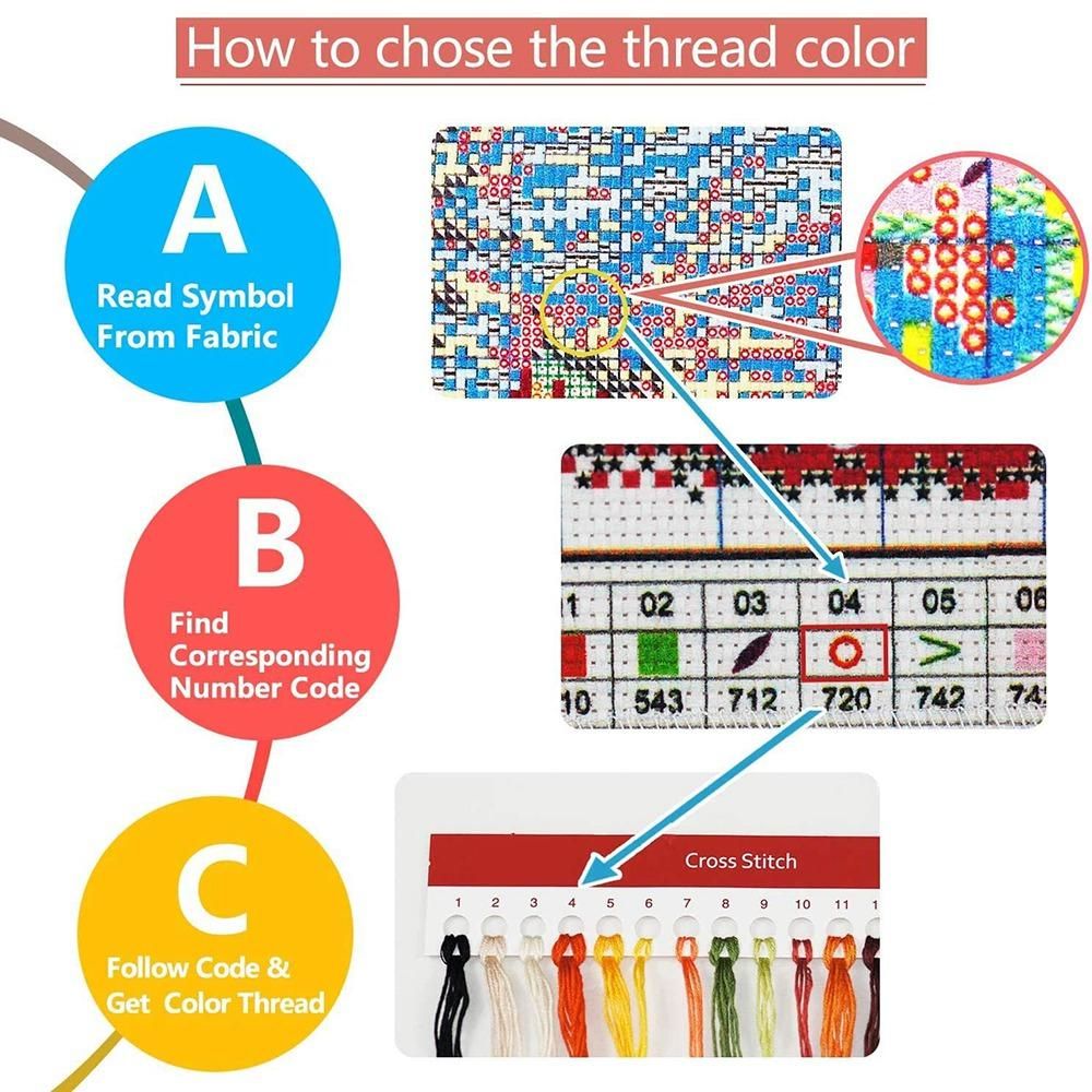 [Notes](14CT) use 2 strands for full .1 strands threads for back . After finishing. put the pattern in warm water for 20 minutes.then dry.and then you can make a for it as you like.→Important:→ do not the -stamped pattern wet you finish it because it is washable. Color blocks on the printed pattern are color of the floss. be to use the colored tread according to the symbols. Why Kits?