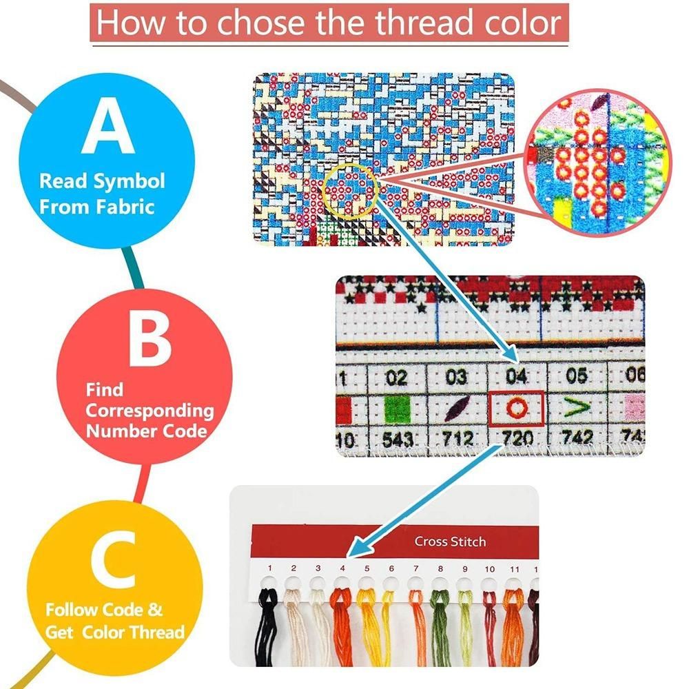 . The symbols on the fabric have a corresponding number code. Just read the , such as, "x" "☆",and pick out the color the number code tells. Thus you can begin your . Only the above package content, other are not included.