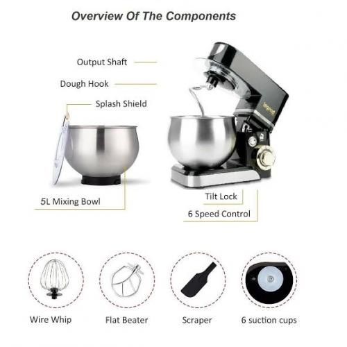POWERFUL BOWL MIXER - Baking the quantities needed for large families requires good sized containers and powerful motors. Often these can only be found with commercial food mixers used in restaurants, however, the royal Bowl Mixer with its 5 Litre stainless steel mixing bowl and powerful motor will easily handle all your large quantity baking and mixing tasks.The five-litre capacity stainless steel mixing bowl means you can whip up a dozen eggs at a time or make a hell of a lot of cake batter - almost 3kg of it, enough for two or three cakes.The six speed settings, a powerful motor with robust design, means this stand mixer sits firmly on your work top and is sturdy and stable, even when mixing large quantities at high speeds. Whilst the splash guard/cover minimises splashing and mess.When you're adding ingredients in stages the tilt head design allows you to check the mix and add or remove the bowl easily.Aside from the high quality plastic housing which it sturdy and easy to wipe down the bowl and attachments ( dough hook, beater and balloon whisk) are all made of stainless steel, making them durable, hygienic, and easy to clean, even in a dishwasher.As food stand mixers go if you need something approaching a professional level bowl mixer you can't beat (for give the pun) the Bowl Mixer.