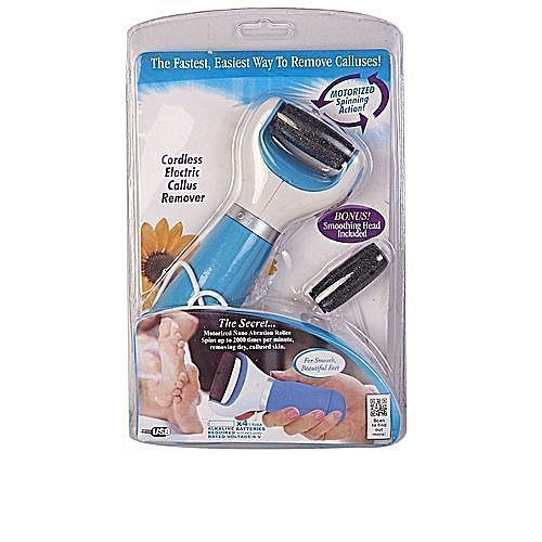 This callous removal is a Motorized Nano Abrasion Roller spins up to 2000 times per minute removing dry, callused skin fastest and easiest way to remove hard and irritating calluses. Just switch it on and the precision engineered Nano Abrasion Roller spins up to 2000 RPMs to quickly remove calluses and dead skin. as a bonus, use the Smoothing Head (Included) to buff your feet to the baby soft smooth skin that everybody lovesEasy to use with the electronic rotating file over hard skin to see the dead skin disappear!Beautifully smooth skin after one useGentle & effective rotating action that allows you to utilize the entire rollerBattery Operated Ready to useExfoliates Quickly and EasilySafe and ErgonomicReplaceable roller head