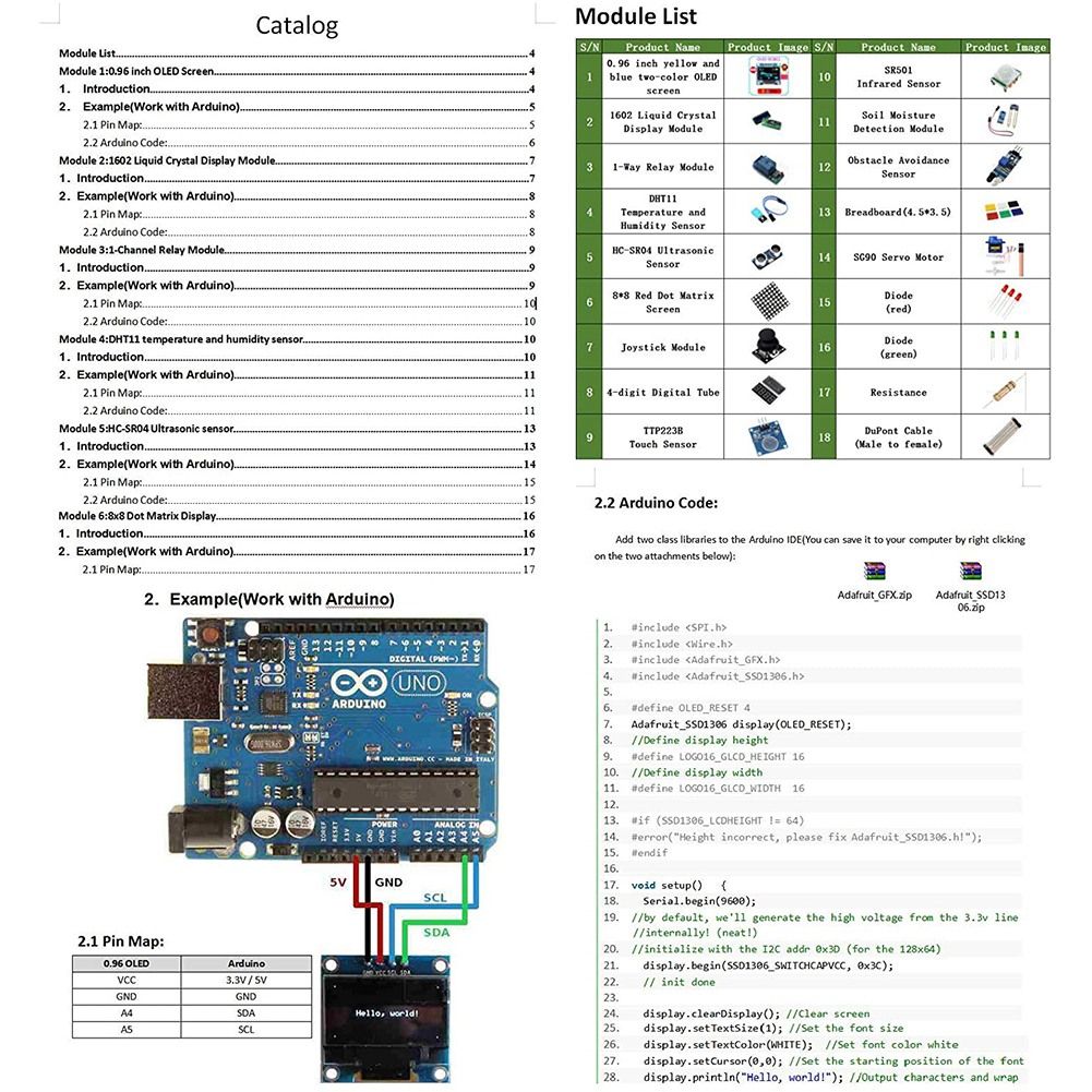 Starter Kits for Arduino Kits R3 Nano V3.0 Mega 2560[New Module][0.96inch OLED]:Made of 128x64 individual Yellow Blue OLED pixels.SSD1306 Driver Chip,controlled by I2C only need 2 wires.[1602 LCD]:with adjustable Backlight,display 2x16 characters.With Adapter Board,only need 4 I/O ports can control it.