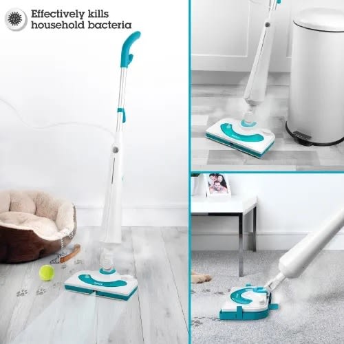 Incredibly versatile, this steam cleaner from Beldray can clean various hard flooring and surfaces including tiles, laminate and stone.The 1300W steam cleaner heats up incredibly quick, ready to use in just 25 seconds providing an amazing 15 minutes of continuous steam.With a generous 5 metre cord and a convenient rotary angle steam mop head, the cleaner is perfect for cleaning the hard-to-reach areas.Complete with added accessories including a micro fibre mop pad, carpet glider, detergent mop head and measuring cup to help you clean.150 years and still growing - Beldray are planting a tree for every Steam Cleaner purchased, providing a more sustainable future.