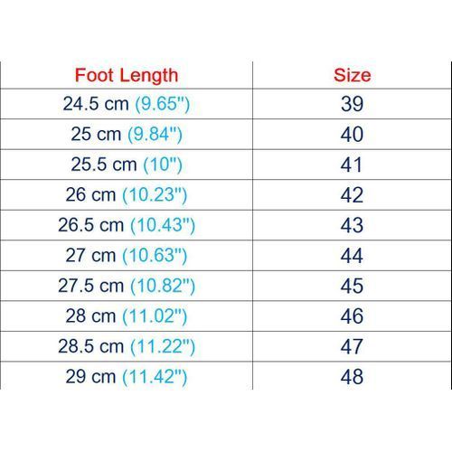 US 8.5 = EU 42/ CN 42 = foot length 260 mm; US 9.5 = EU 43/ CN 43 = foot length 265 mm; US 10 = EU 44/ CN 44 = foot length 270 mm;