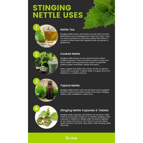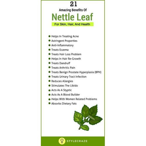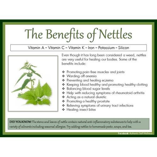 Stinging nettle offers a variety of vitamins, minerals, fatty acids, amino acids, polyphenols and pigments — many of which also act as antioxidants inside your body. Stinging nettle may help suppress inflammation, which in turn could aid inflammatory conditions, including arthritis, but more research is needed. Stinging nettle may help reduce prostate size and treat symptoms of an Stinging nettle offers a variety of vitamin, minerals, fatty acids, amino acids, 4 and pigmentsprostate gland in men with BPH. Stinging nettle may reduce hay fever symptoms. Yet, some research indicates that it may not be much more effective than a placebo. More studies are needed on stinging nettle's effects on hay fever. Stinging nettle may help lower blood pressure by allowing your blood vessels to relax and reducing the force of your heart's contractions. Yet, more human studies are needed to confirm these effects. While stinging nettle may help lower blood sugar levels, more human studies are crucial before recommendations can be made.
