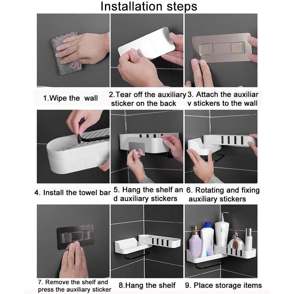 Shower Shelves No DrillingThese adhesive shower easy to install no drilling and no screws, just place adhesive shower shelves's sticker attached the shower rack Done! The shower rack fit for ceramic tile and any non-porous surface with glossy finish. Shower no drill will keep your shower tidy and shower shampoo, soap, , facial cleanser, lotion, brushes all organize and hand reach.Also good for SP Ice , can, and more, saving a lot of space.
