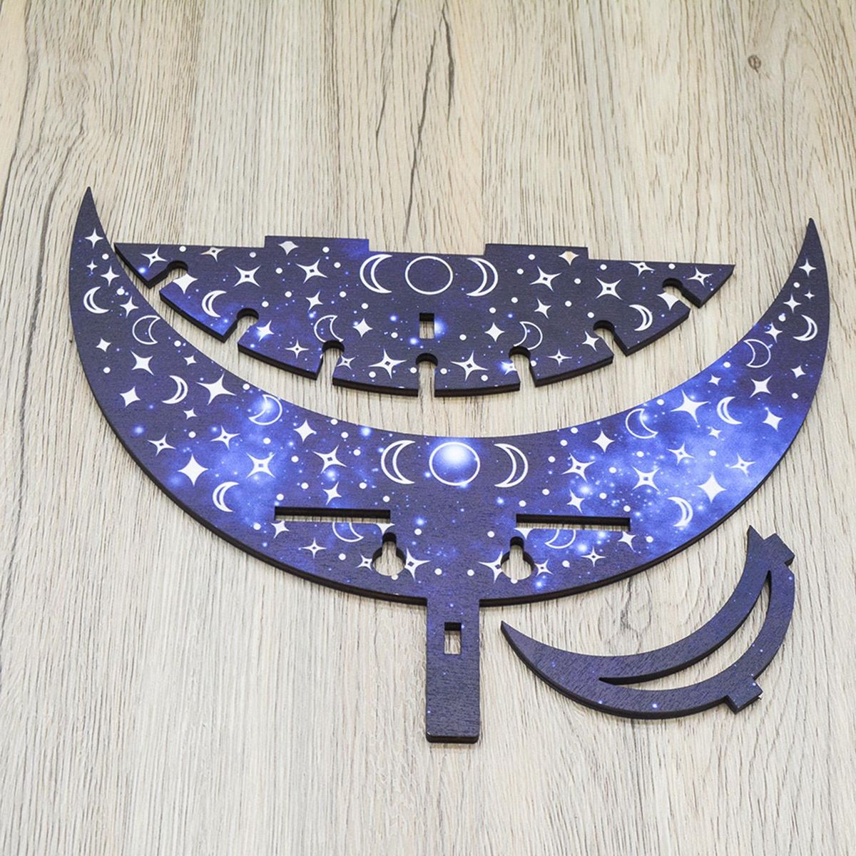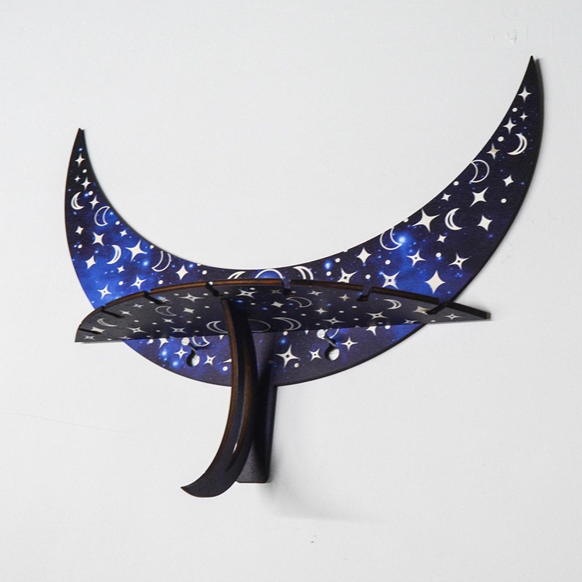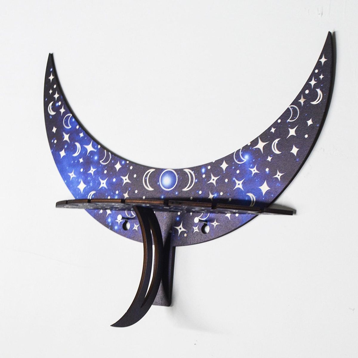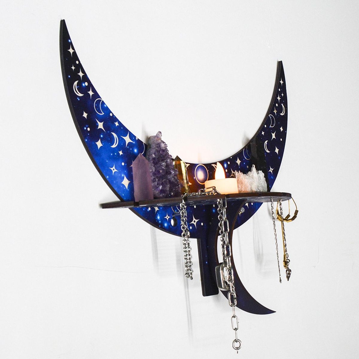 You can store candle holders and jewelry on this crescent-shaped storage shelf that is wall-mounted to save space.
