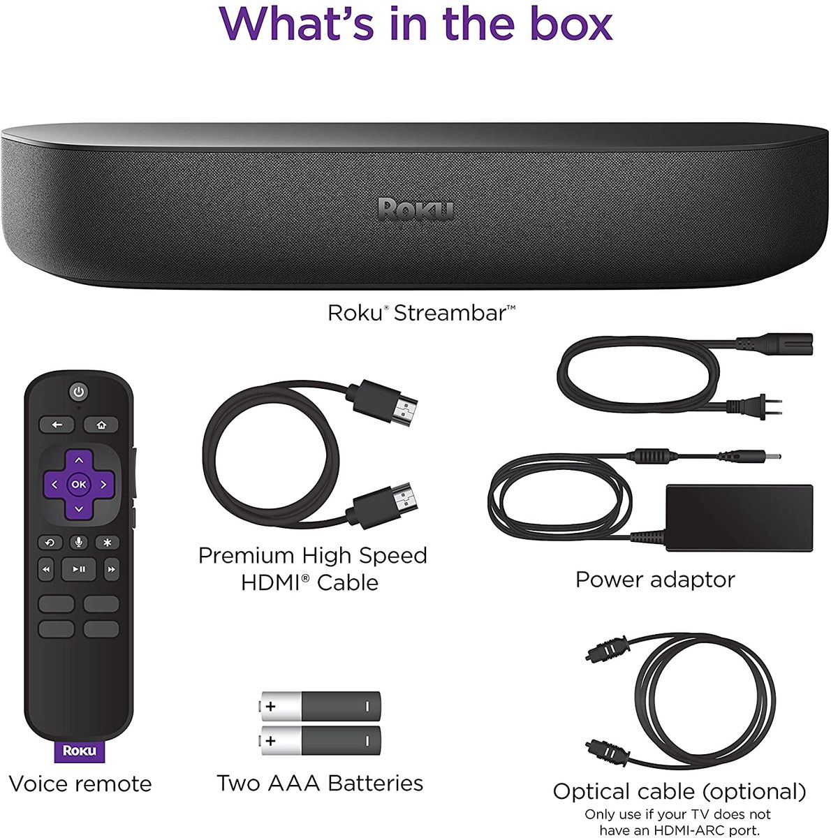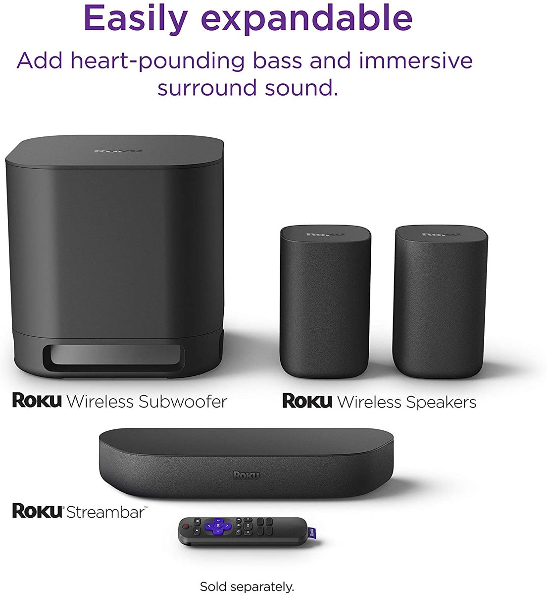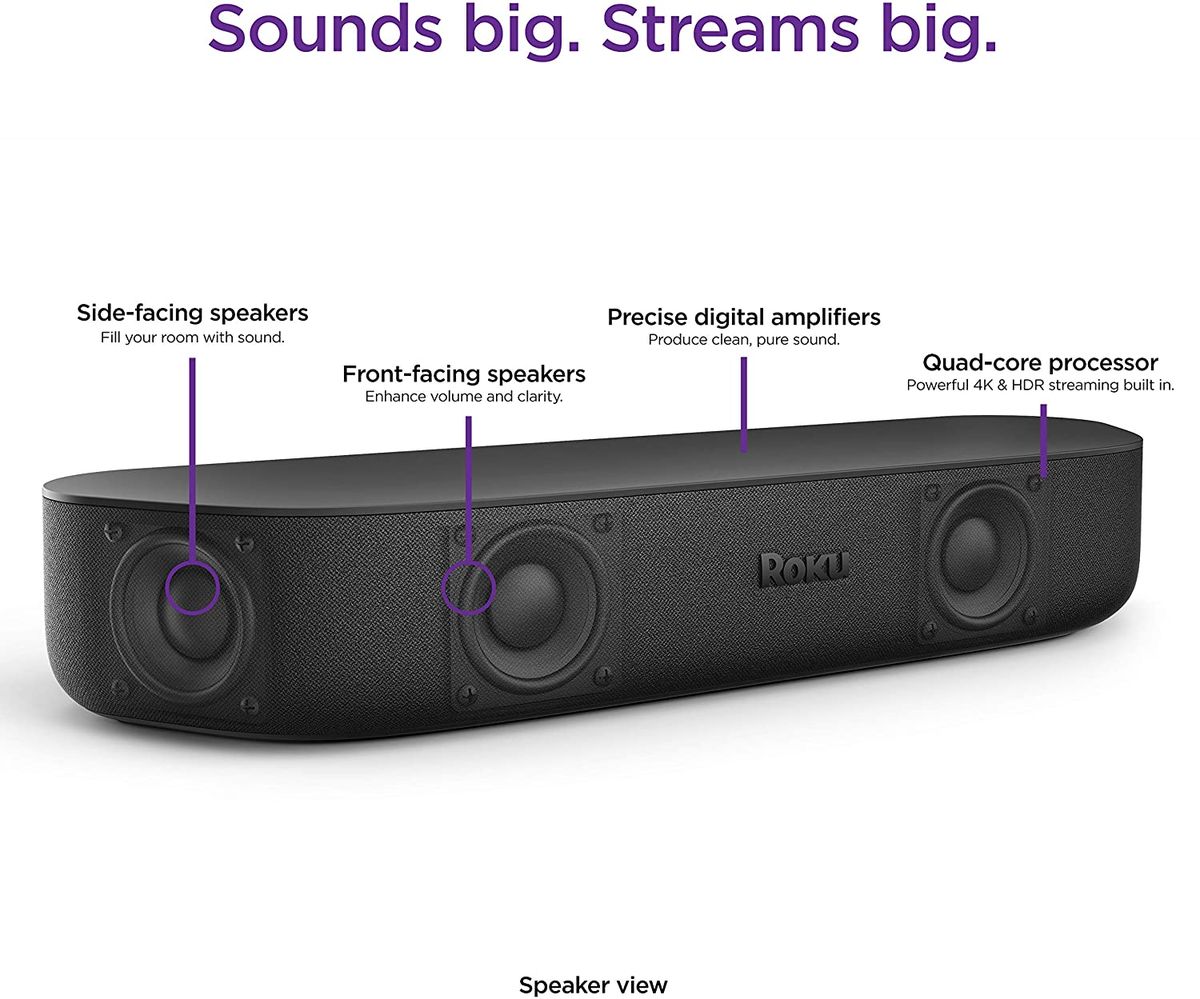 Roku Streambar is the ultimate 2-in-1 entertainment upgrade with powerful streaming and premium sound for any TV. Hear every detail as you stream the newest and most popular channels in vibrant 4K HDR picture quality. Crisp, clean audio makes dialogue easier to hear and with its compact design, you'll be amazed at how something so small can fill your room with sound. You can even quiet loud commercials automatically, plus stream your favorite music and more with Bluetooth. Setup is simple with everything you need in the box, including the Roku voice remote that controls your TV, sound, and streaming. Roku Streambar also works with popular voice assistants. Ask your Alexa or Google Assistant-enabled device to launch channels, search for entertainment, control your streaming, and more. Plus, it's easily expandable for even bigger sound. Add deep, rich bass with Roku Wireless Subwoofer and immersive surround sound with Roku Wireless Speakers (sold separately). There's no need to run cables across your living room. Just plug in these speakers and subwoofer and wirelessly pair them for even better sound.