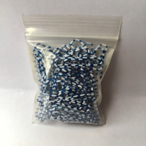 Pack of blue and white striped paper clips