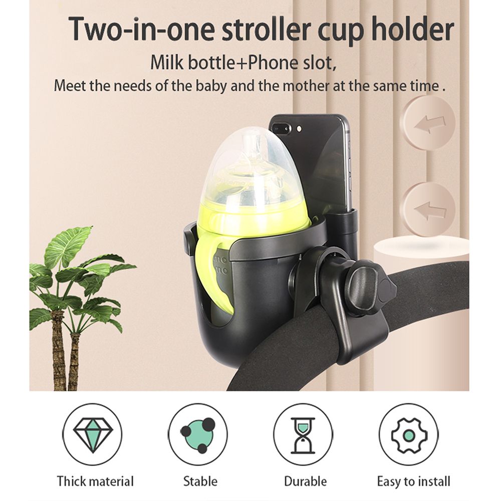 Stroller Cup Holder 2 in 1 Phone & Bottle Holder with Anti-slip Pad Universal Cup Holder Rack for Buggy with Adjustable Clamp