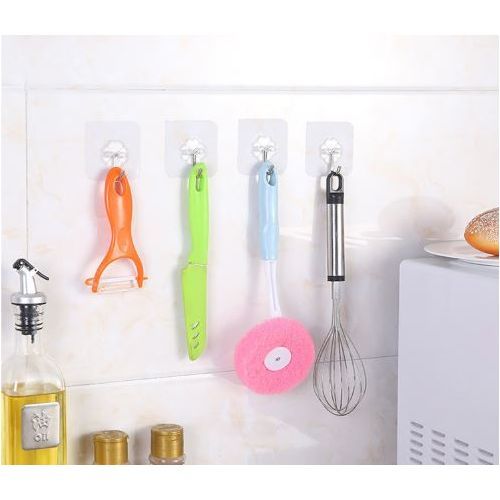 This item is our economic self-adhesive hook, comes with 10 pieces, it's made of high quality transparent PVC and stainless steel, including the strong glue, the size is compact to save space when you stick it on the bathroom wall, kitchen wall, even the door or furniture, it can