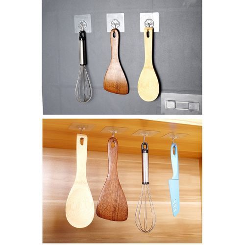 This item is our economic self-adhesive hook, comes with 10 pieces, it's made of high quality transparent PVC and stainless steel, including the strong glue, the size is compact to save space when you stick it on the bathroom wall, kitchen wall, even the door or furniture, it can