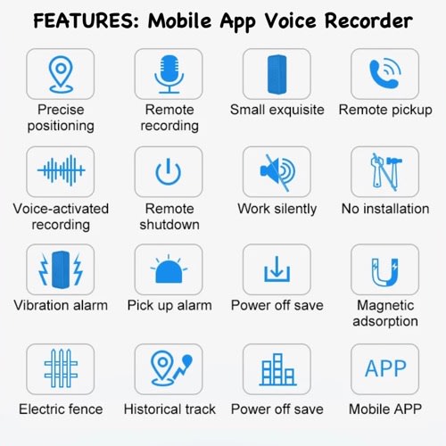 FEATURES:*HD recording *Magnetic adsorption *Long time recording *One-click recording *Sound Activated Recording *32GB memory capacity*Built-in cache Encrypt documents *No sound, No light indication.*Long-distance noise reduction *Mobile phone OTG *Save files automatically when power is lost.