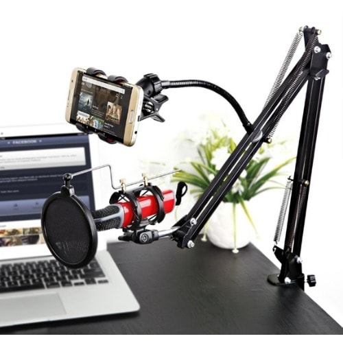 Dual suspension springs on each boom arm, protects microphone from shaking, suddenly dropping and making noise. Comes with one table mounting clamp, an adjustable positioning screw, can easily clip to any desktop up to 2.15"/5.5cm thick.