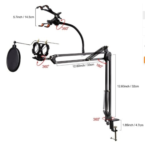 Professional Microphone Stand is a convenient and useful invention widely used in live broadcasting, podcast, solo artist, etc. With the upgraded heavy duty design, it delivers great load-bearing (More than 4.4 pounds / 2KG) and long-time performance. Moreover, the foldable arms allow you to carry it with you easily. Easy to set up and adjust the arm to your favorite position FEATURES -Suitable for Blue Yeti, Snowball, Blue Spark and other microphones. -Super-strong spring. -Comfort to pull and draw, fold out of the way you exactly need it to be. -Adjustable clamp for placement on uneven surfaces. -Great microphone arm for beginners. -Longer bracket arms, bigger table clamp mouth, best holiday gift to your family party, announcer, music lover. -Material: Premium Steel (Frame & Clamp) and ABS Plastic (Mic Clip) Arm -Length: 14.5"/36.83cm -Desk Clamp: 2.15"/5.5cm (Max) -Support Weight: More than 4.4 pounds / 2kg -Mic clip: More than 1.77 & rsquo; & rsquo; / 4.5cm Caution -Please hold both arms and slowly open first time. -The base is not fixed on the glass table -Microphone and Pop Filter in the pictures NOT INCLUDED