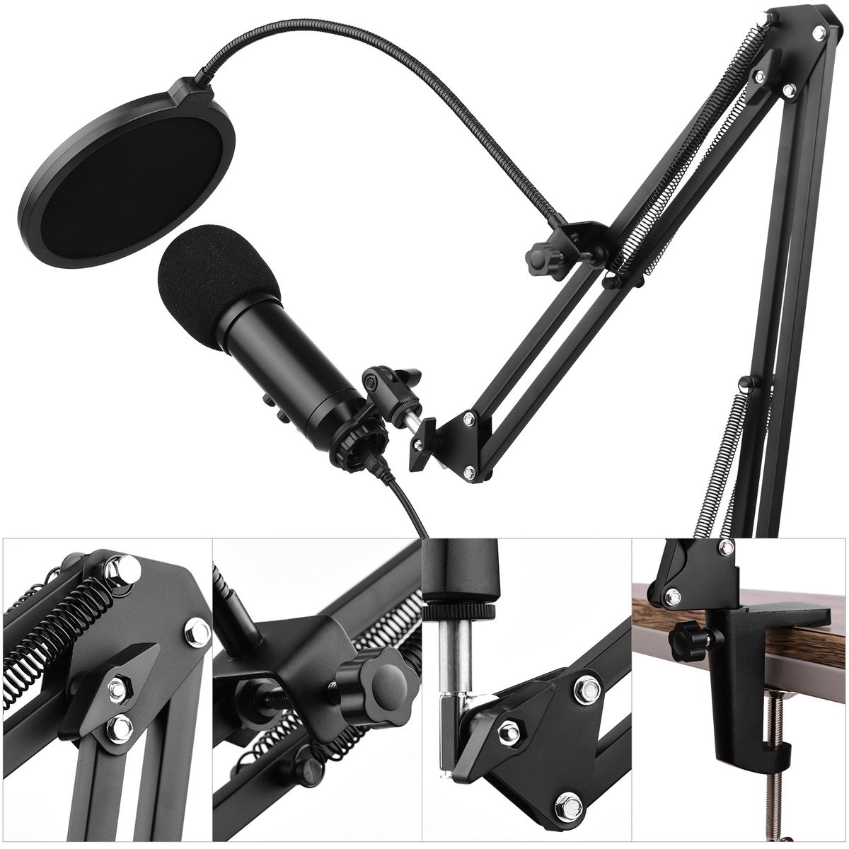 The anti-wing foam windscreen and pop filter can make your sound more clear; the flexible metal scissor arm stand allows you to mount the microphone to desktop edge easily (thickness less than 6cm).