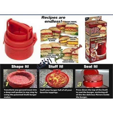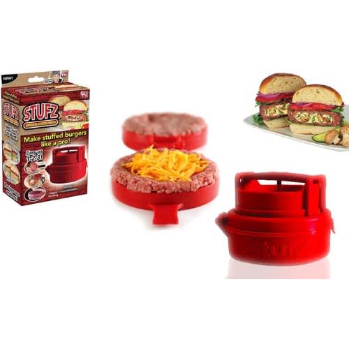 Make3 Stufz Sliders at a time with the Stufz Slider the stuffed burger maker. Stufz Sliders Stuffed Burger Maker as seen on TV. Make delicious, mouth watering burgers stuffed with you favorite filling, cheese, mushrooms, garlic, onions whatever you want. It's easy as 1 shape it, 2 stuff it, 3 seal it! Stufz creates a deep cup to hold your filling, and seals the sides for a perfect leak proof burger and locking flavor in. Stufz easily pops out the burger when ready. Dishwasher safe. Includes 3 cavity slider burger press and instructions.
