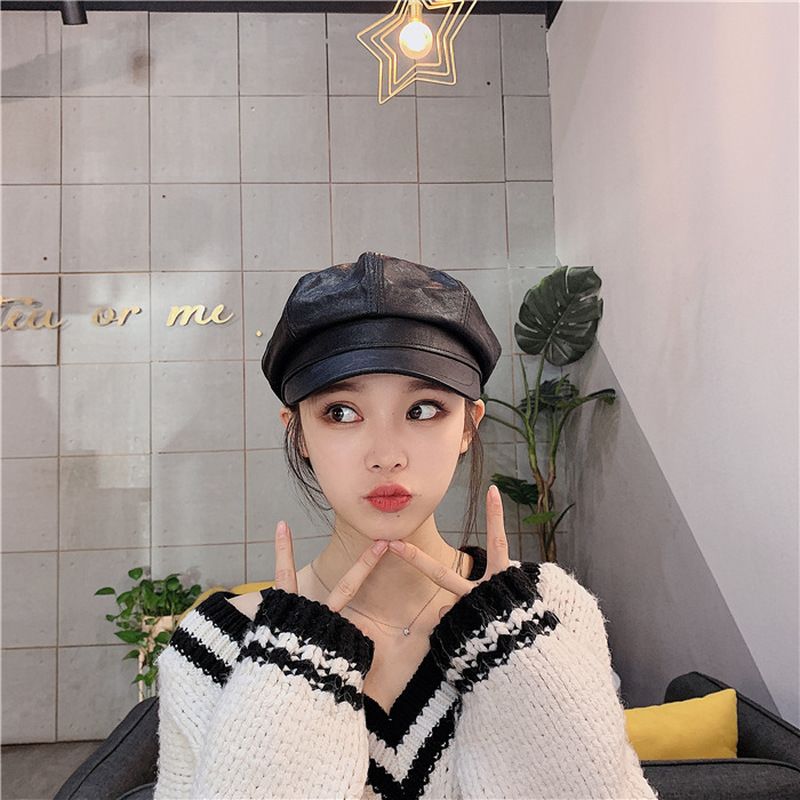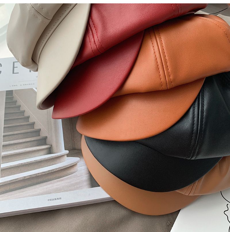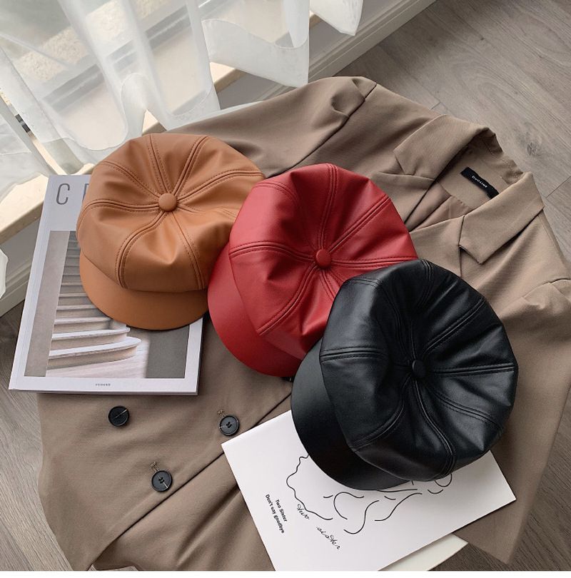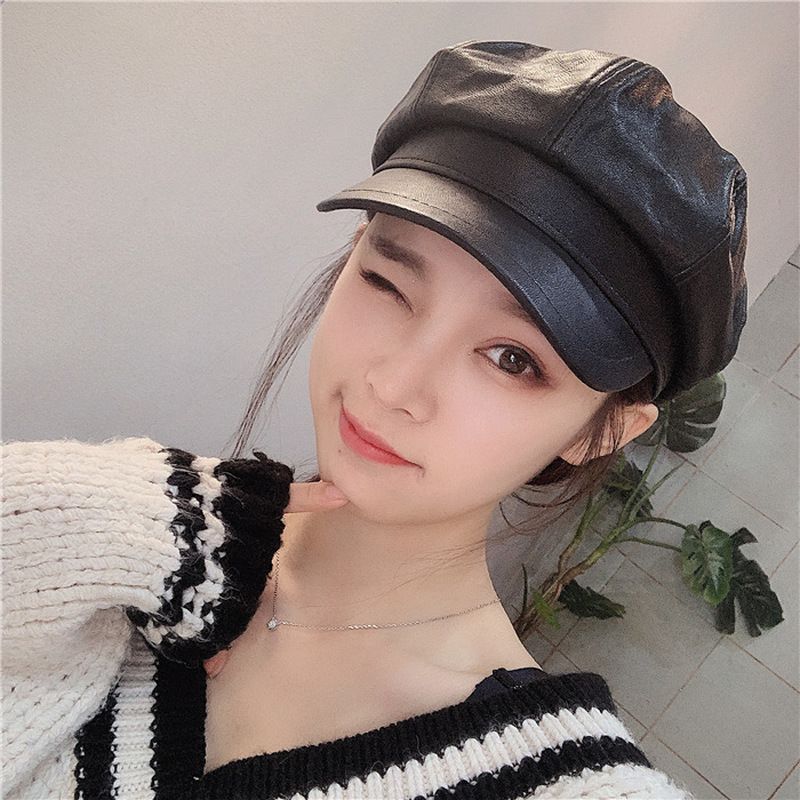 1X New style retro ladies ladies autumn winter beret hats PU leather British style flat top octagonal hat adjustable female hats