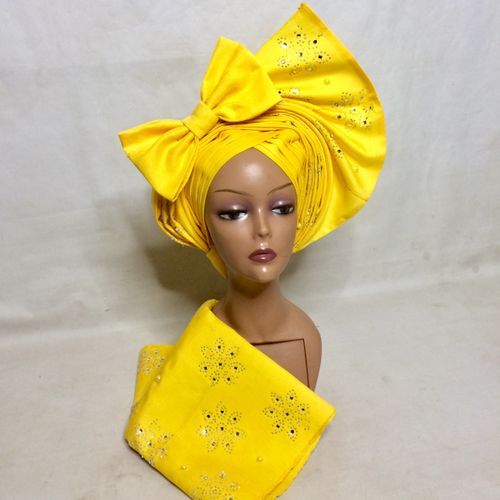 This Embellished Yellow autogele ( ready to wear) is a beauty to behold. this style is unique and elegant . Suitable for brides, celebrants and classy ladies with good taste. designed carefully with 4 straps for easy wear and good fitting.has elastic band to make it adjustable for all head sizes . made with shiny light weight asooke and sits comfortably on the head.