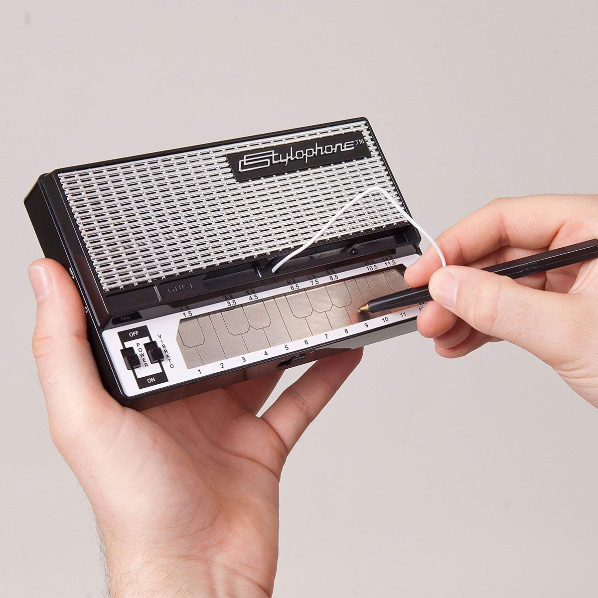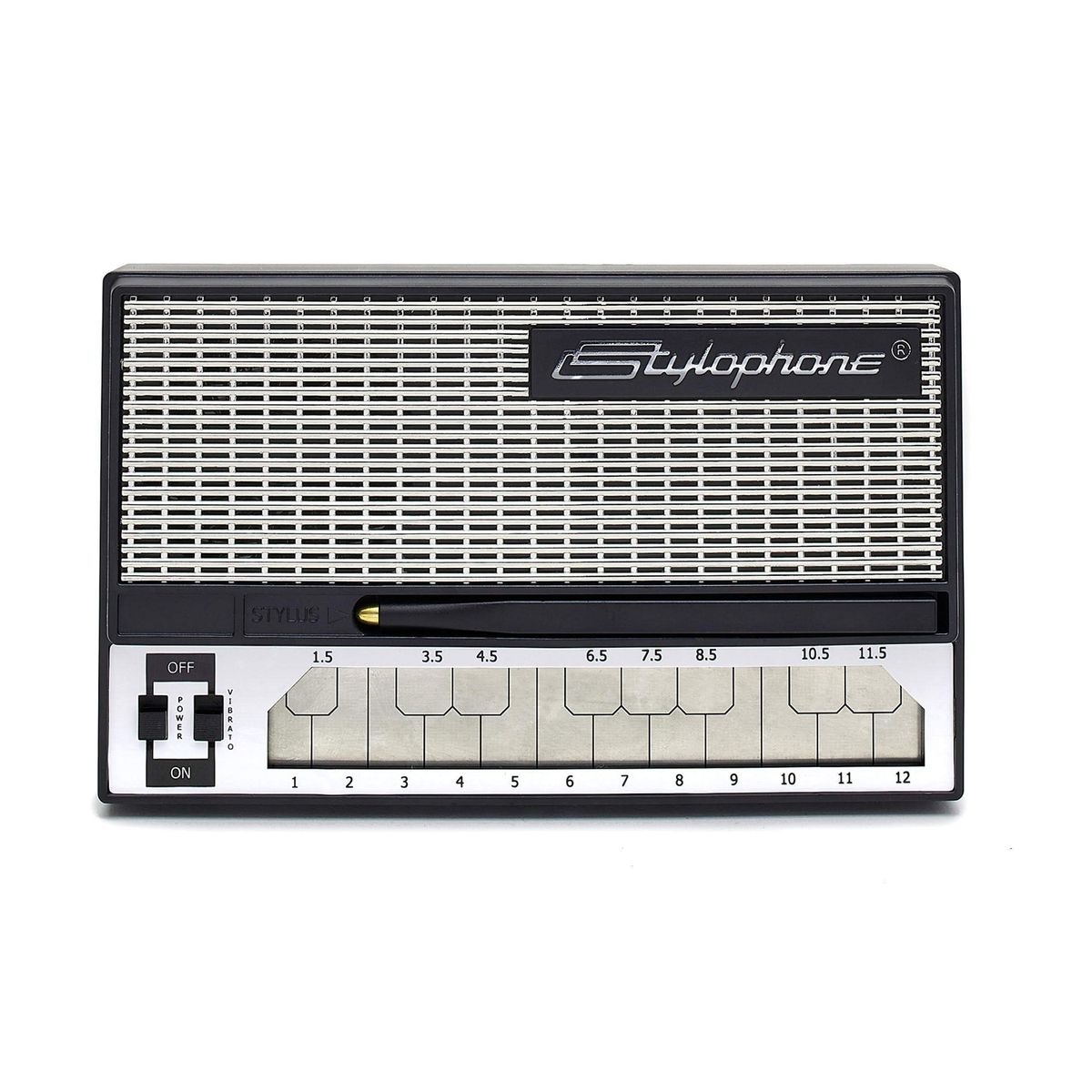 The Stylophone is played by tapping and sliding the connected stylus along the touch-sensitive metal surface. Each segment on the surface plays a different note, the same as different keys on a piano. But unlike the piano, it's so simple to play that anyone can have a go - perfect for beginners!