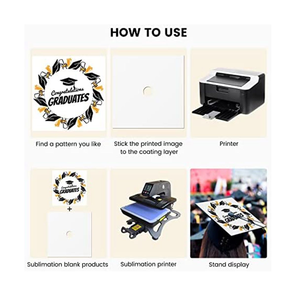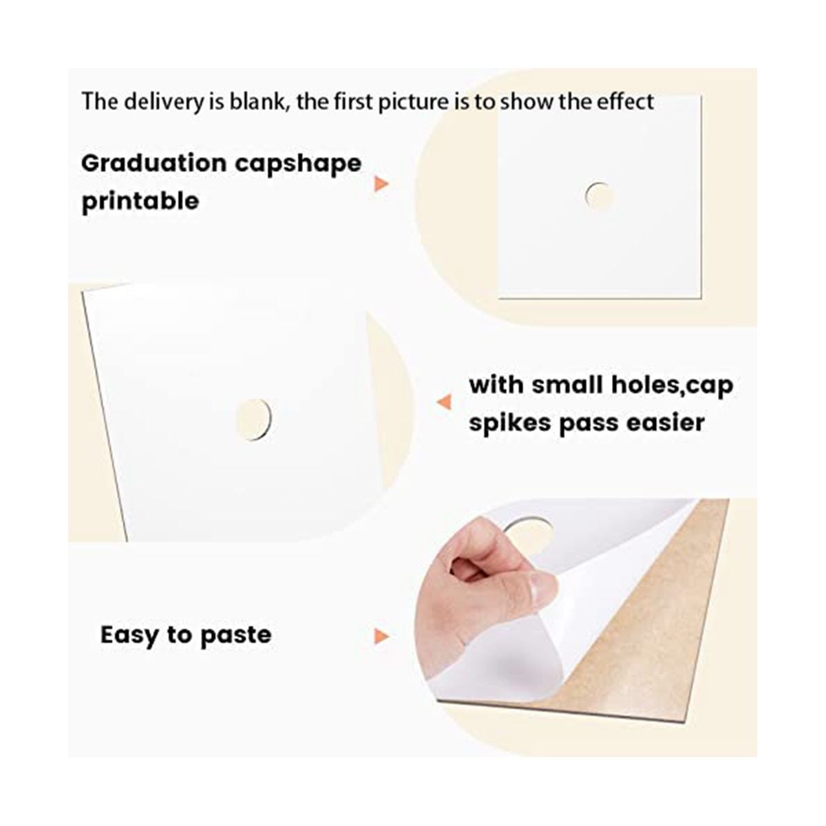 the punched hole in the middle makes it easy to apply. Blank grad hat topper with flat and surfaces can help keep photos bright and text clear. Self adhesive design on the back can firmly attach to the graduation hats.