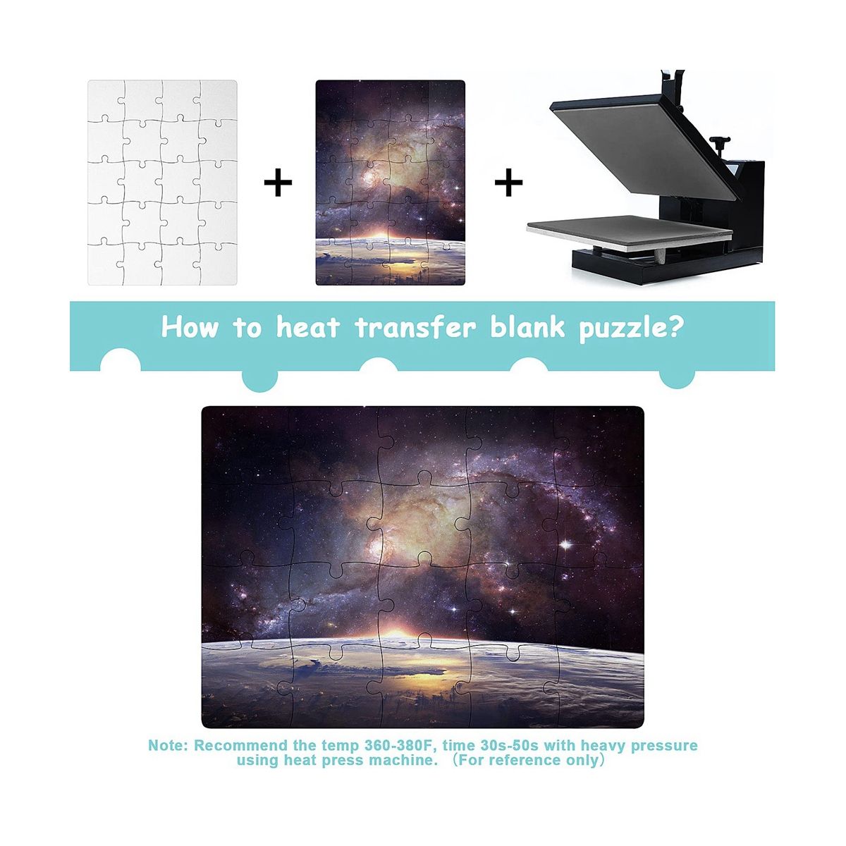 How to use: if you sublimate your favorite photos on the puzzle, personalize it first, wait for it to dry, and then take apart the puzzle pieces and enjoy the puzzle game; You can also with your friends or family together; The recommended temperature is 360-380 F, lasting for 30-50 seconds with with heavy pressure using heat press machine