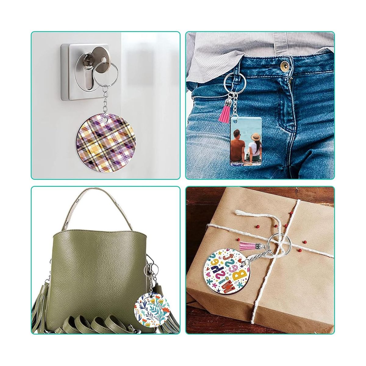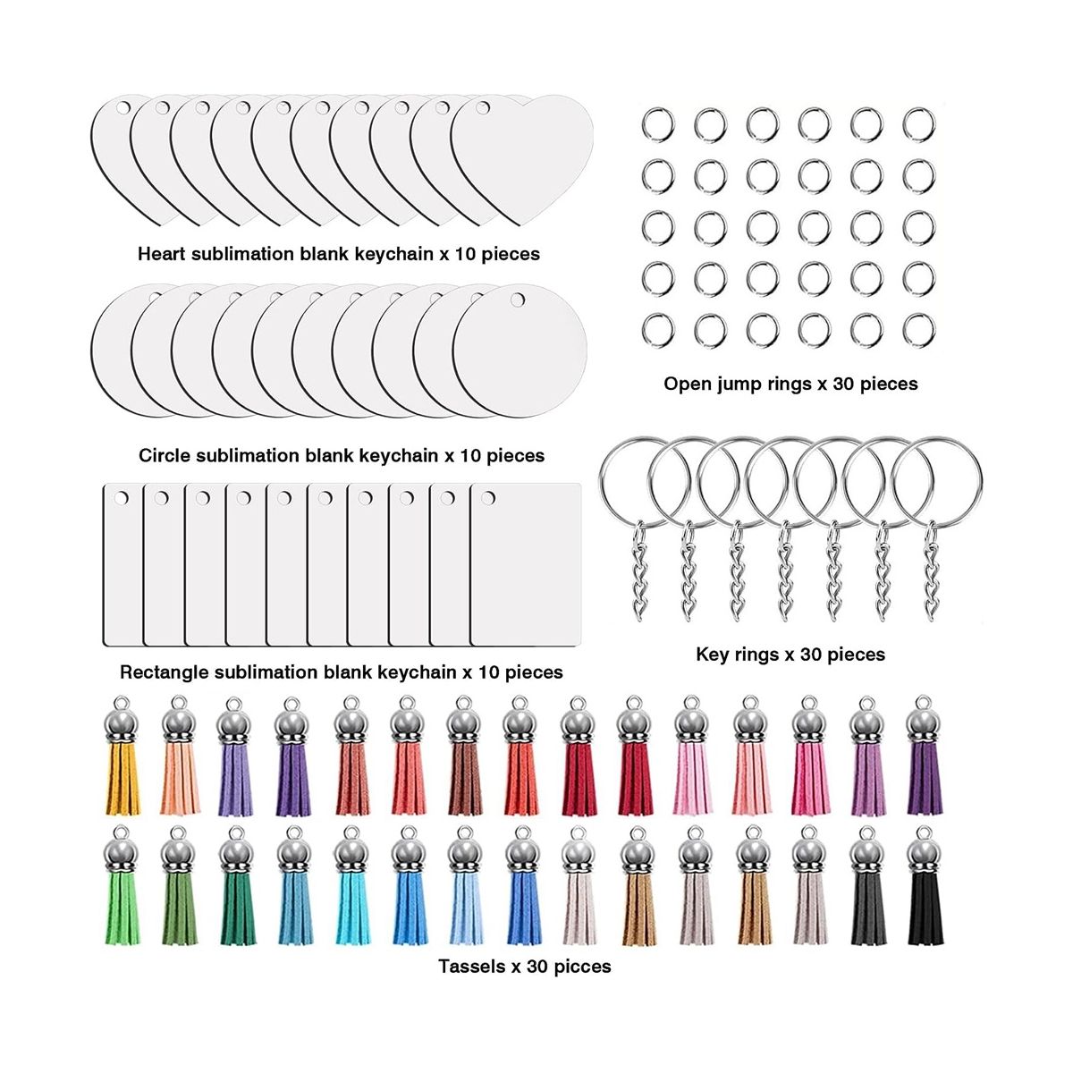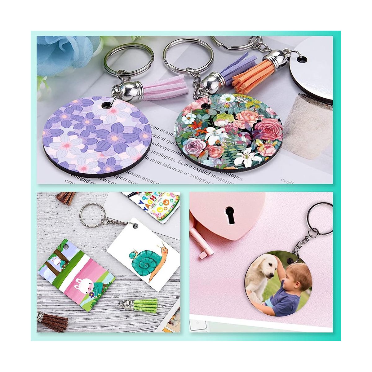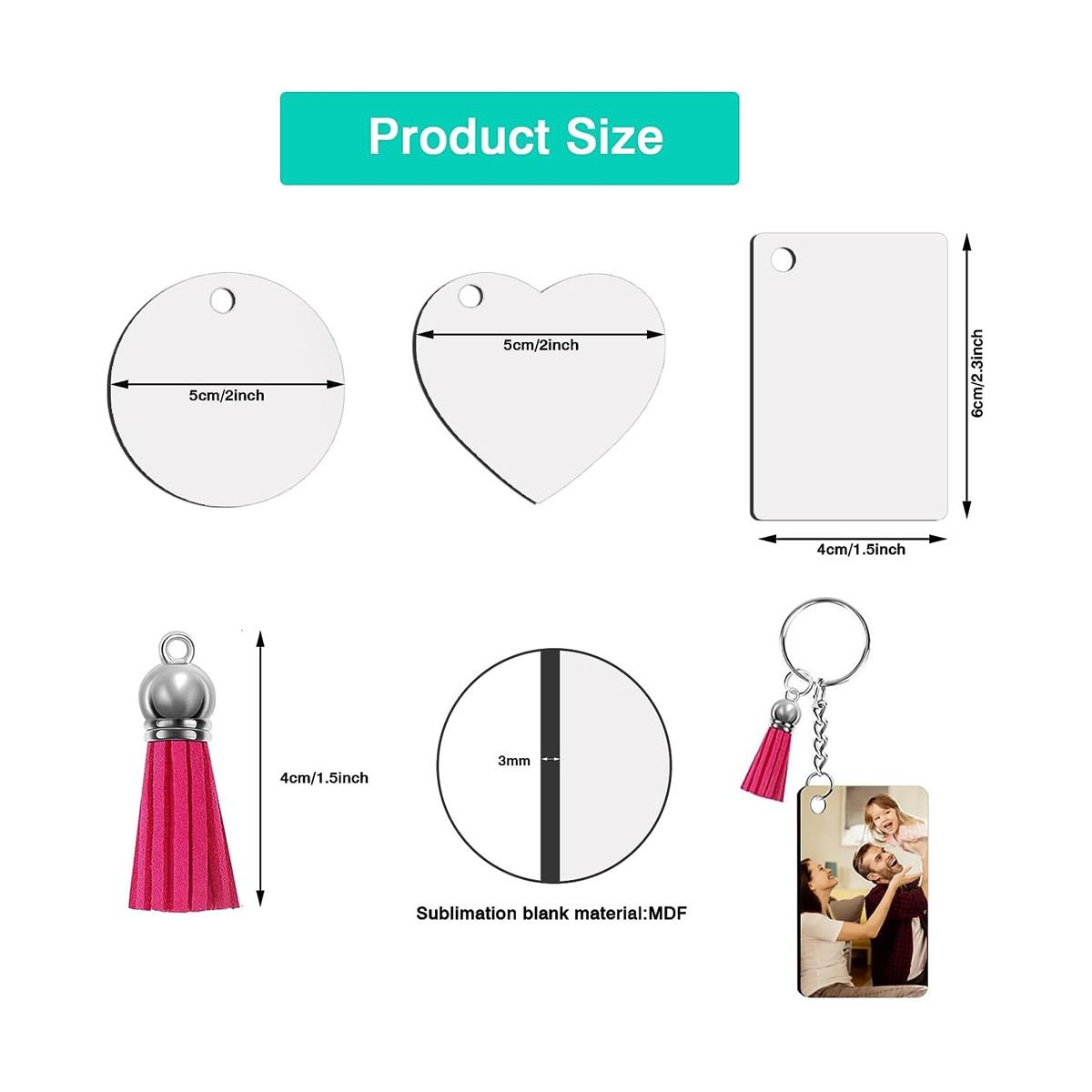 Dye Sublimation Key Ring Blank Set - You will receive 30pcs keyrings with chain, 30pcs colorful tassel pendants, 30pcs heat transfer MDF blanks in 3 shapes, 30pcs jump rings, 120pcs in total, many matching pieces, you You can DIY according to your own preferences
