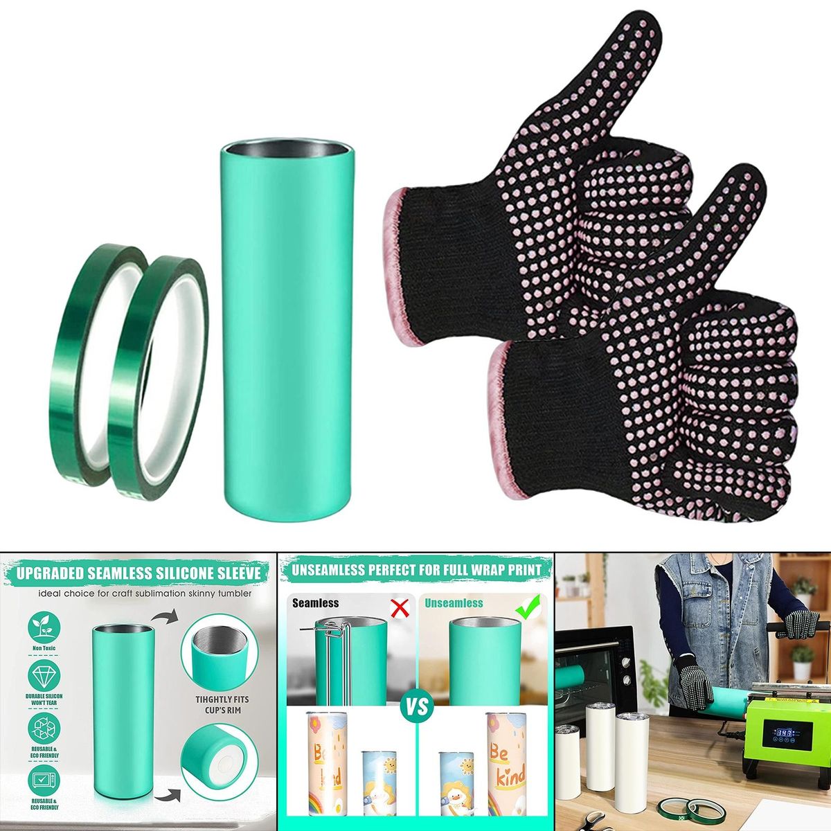 This package includes 1 piece silicone sleeve (for 20 oz tumbler), 2 pieces transfer tape, 1 pair heat resistant , help you make beautiful cups. Suitable for both beginners and professional designers, the best choice is for those who pursue perfect results.It can perfectly wrap and fix the straight cup during the sublimation process, preventing pattern misalignment and deformation, and making the sublimation image heat transfer more smooth and uniform.Made of silicone, durable for long time use. Seamless silicon design will not leave blank gap and vague part into the tumbler. Easy to use.Suitable for variety of cups, the seamless sublimation wrap sleeve fits the sublimation tumblers tightly.It fits the cup perfectly, DIY your own cups, you can handmade a great gift for your friends and family.