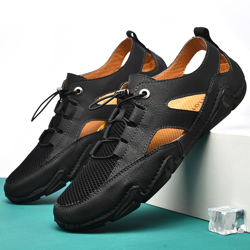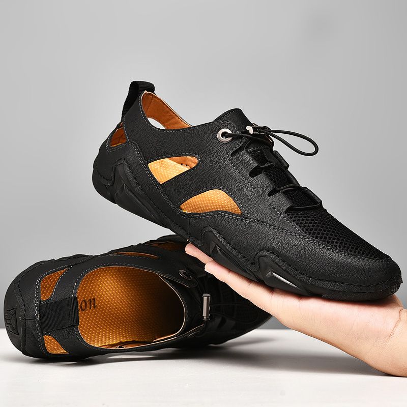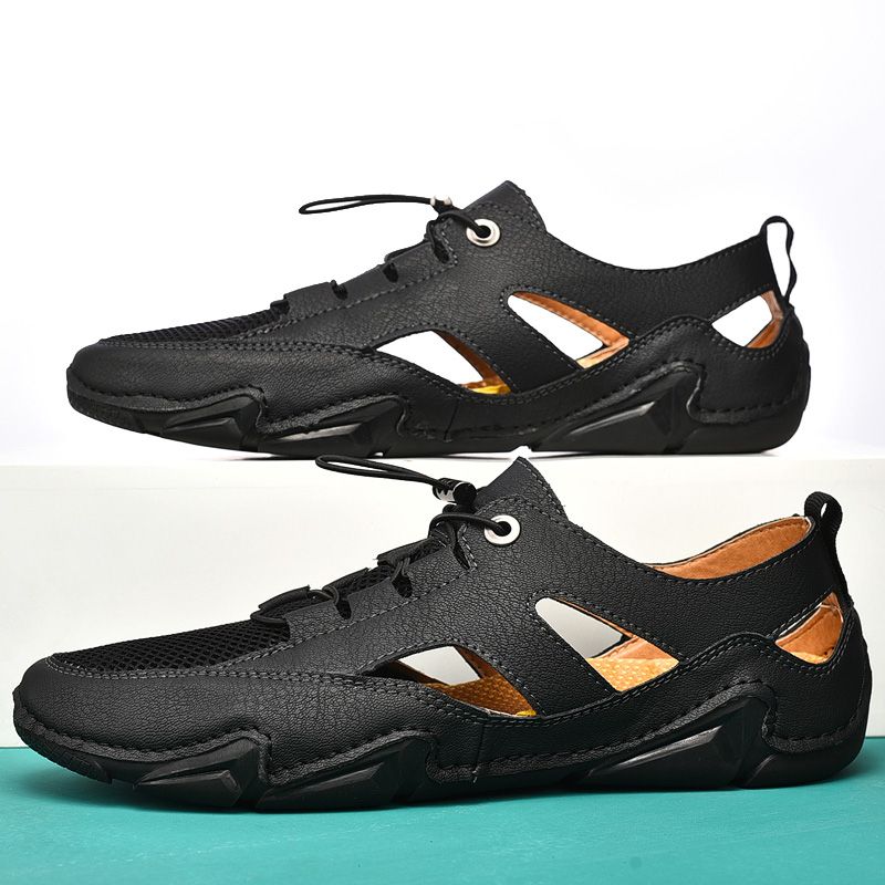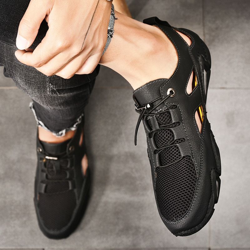 Buy Summer Mesh Men Sandals Big Size 38-47 High Quality Breathable Leather Casual Shoes Men Beach Sandals Fashion Outdoor Handmade Flat Shoes Black in Nigeria