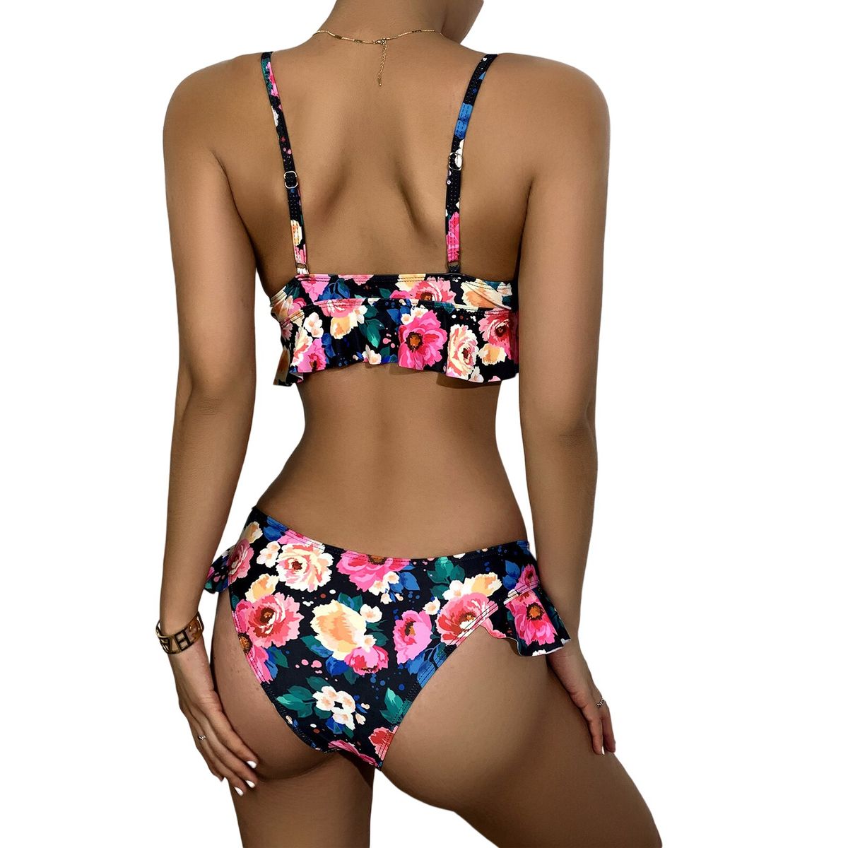 1X Summer Women y Floral Bathing Suits Ladies Flower Print Spaghetti Strap Ruffle Padded Bikini Tops+Swimming Bottoms Swimwear