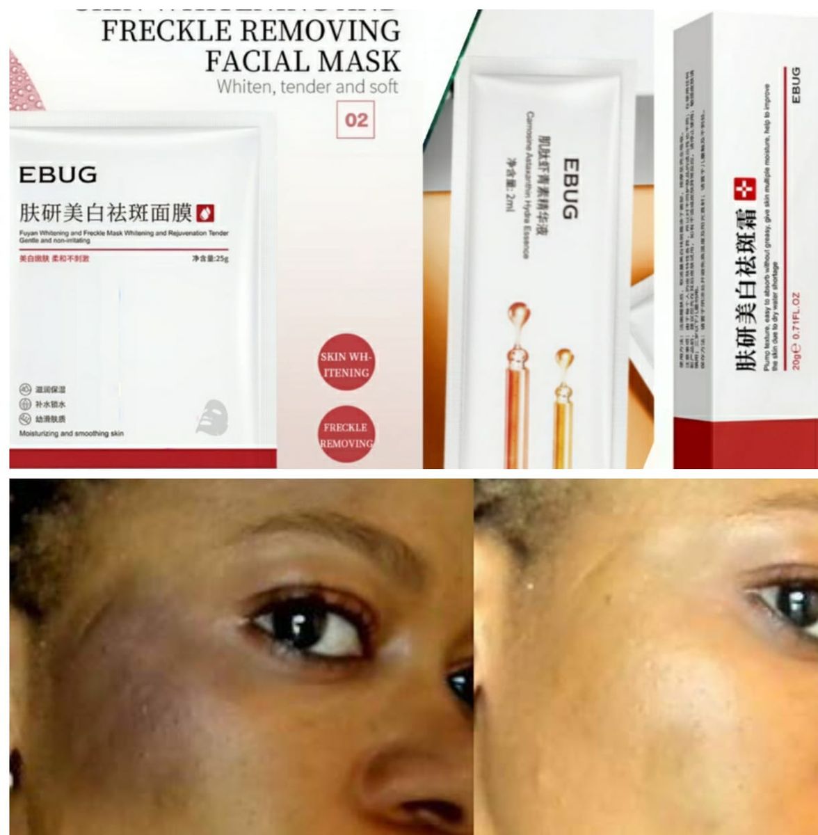 3in1 dark spots, sunburn , freckles and melasma removal kits.Sunburn, Dark Spots & Freckles removal cream + Sheet Mask + Astaxanthin Serum 2ml -Remove stains Combat freckles - Sunburn eraserRemoves acne scars -Removes dark spots & melasma.Please read the description for directions on how to use the products.Follow the routine and instructions judiciously for a better and faster results.