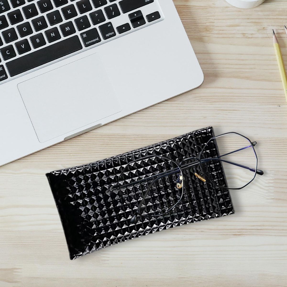 PVC: Sunglasses storage bag, made of PVC leather, portable and waterproof.3D Design: 3D diamond shape, effective anti-pressure, better protection of glasses.Elastic: Elastic pocket design, high quality elasticity, no deformation.High quality: Regular and fine sewing, smooth and not off the line.Fit for: Suitable for regular glasses within 17x8cm.