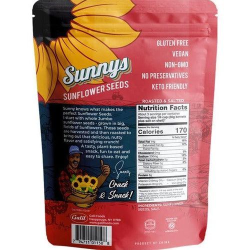 Delicious Jumbo Sunflower Seeds - roasted to bring out that delicious, nutty flavor and satisfying crunch! These are Premium sunflower seeds harvested from big blooming sunflower fields! They are a tasty, plant-based snack, fun to eat, and easy to share. Our resealable bags keep your seeds fresh and full of taste while you crack & snack! Gluten-FreeVeganNON-GMONo added preservativesA keto-friendly snack Vacuum-sealed bags ensure you get a fresh bag every time Resealable bags for freshness! Ingredients: sunflower seeds, salt. Certified Kosher