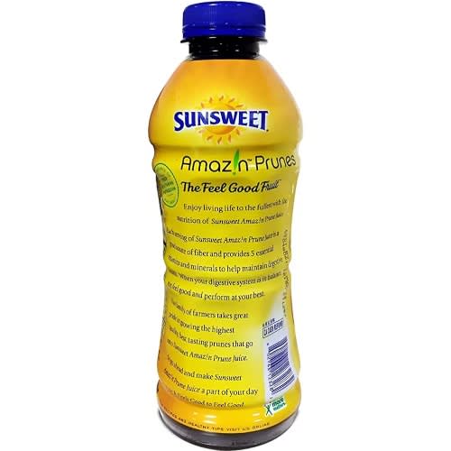 DescriptionSunsweet Prune juice are 100% fruit juice. Water extracted from dried prunes, it is sweet, smooth and very delicious. Made from plump, juicy prunes, it is a good source of iron and potassium. It has no added sugar or artificial preservatives. 100% Juice. Natural digestive health. 5 Vit & Min: 5 Essential vitamins and minerals. Consumers' no.1 choice taste & quality. The Feel Good Fruit. Enjoy living life to the fullest with the nutrition of Sunsweet Amaz!n Prune Juice. Each serving of Sunsweet Amaz!n Prune Juice is a good source of fiber and provides 5 essential vitamins and minerals to help maintain digestive health. When your digestive system is in balance, you feel good and perform at your best. Our family of farmers takes great pride in growing the highest quality, best tasting prunes that go into Sunsweet Amaz!n Prune Juice. So go ahead and make Sunsweet Amaz!n Prune Juice a part of your day because it feels good to feel good. Pasteurized. Fruits & veggies more matters.