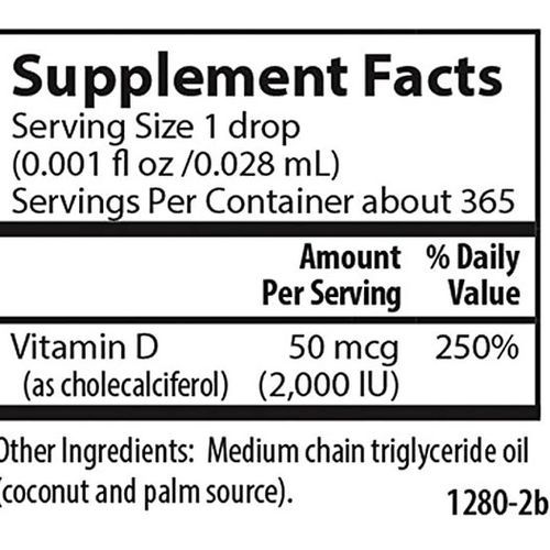 - 2,000 IU (50 MCG) VITAMIN D3 - A single drop provides 2,000 IU (50 mcg) of vitamin D3 as cholecalciferoLl. Place a drop in your food or drink.